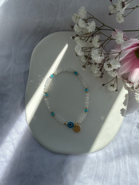 Perlenarmband mit Weißen und Blauen Kristallperlen und goldenen Details + Nazar und Goldene Taler Anhänger - 10757