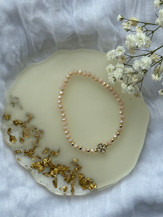 Perlenarmband mit Beigen Kristallperlen und Zirkonia Kleeblatt Anhänger - 10521