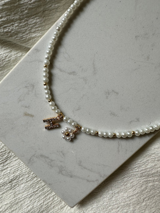 Perlenkette mit Weißen Perlen und Blumen und Buchstaben Anhänger - 10221