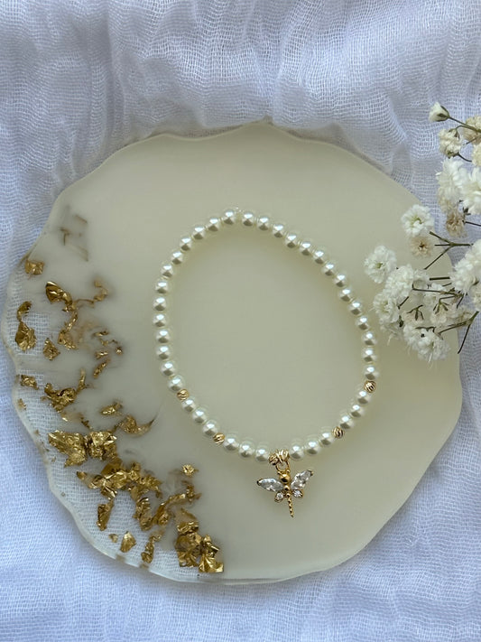 Perlenarmband mit Weißen / Beigen Glasperlen und Libellen Anhänger - 10505