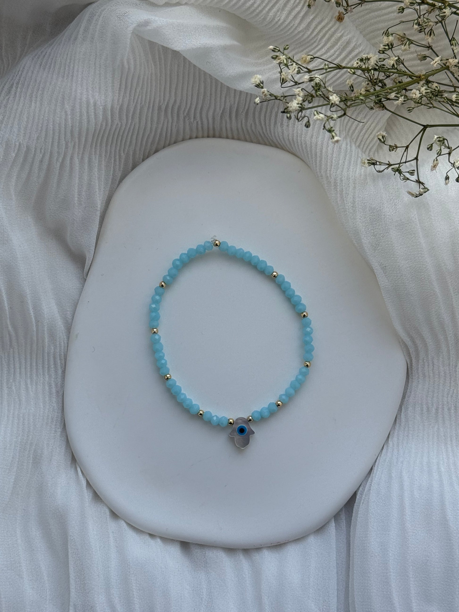 Perlenarmband mit Hellblauen Kristallperlen und Goldenen Perlen + Fatimas Hand Anhänger - 2093