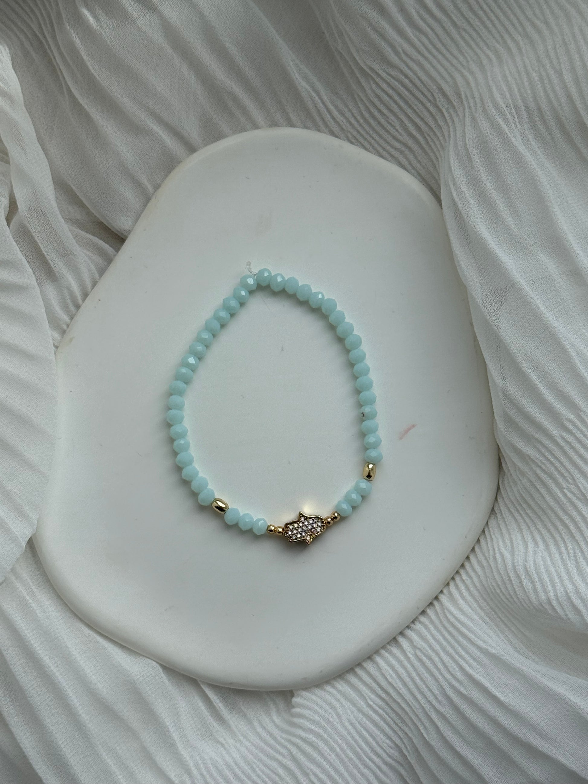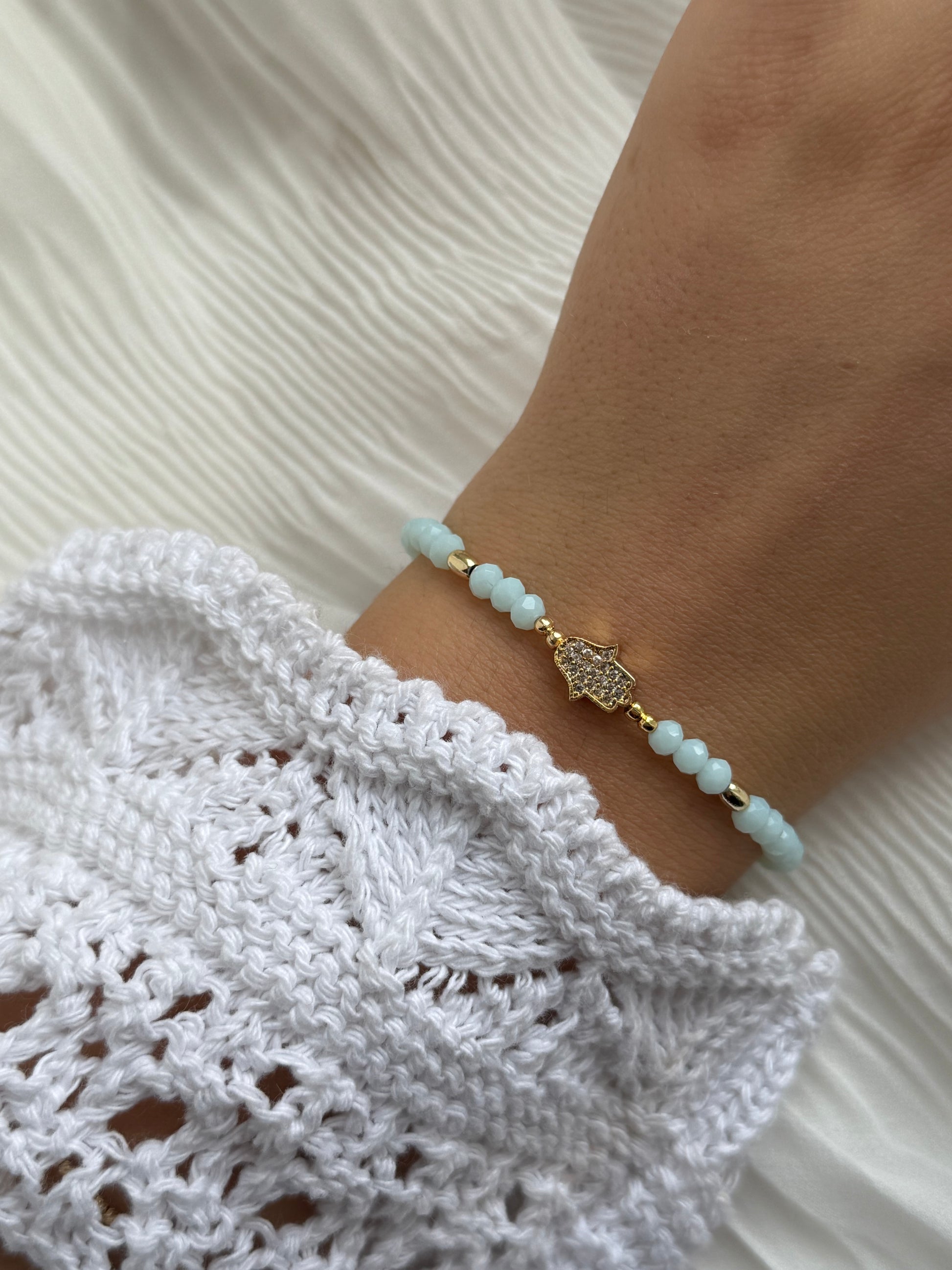 Perlenarmband mit Türkisen Kristallperlen, Goldenen Perlen + Fatimas Hand Anhänger - 111176