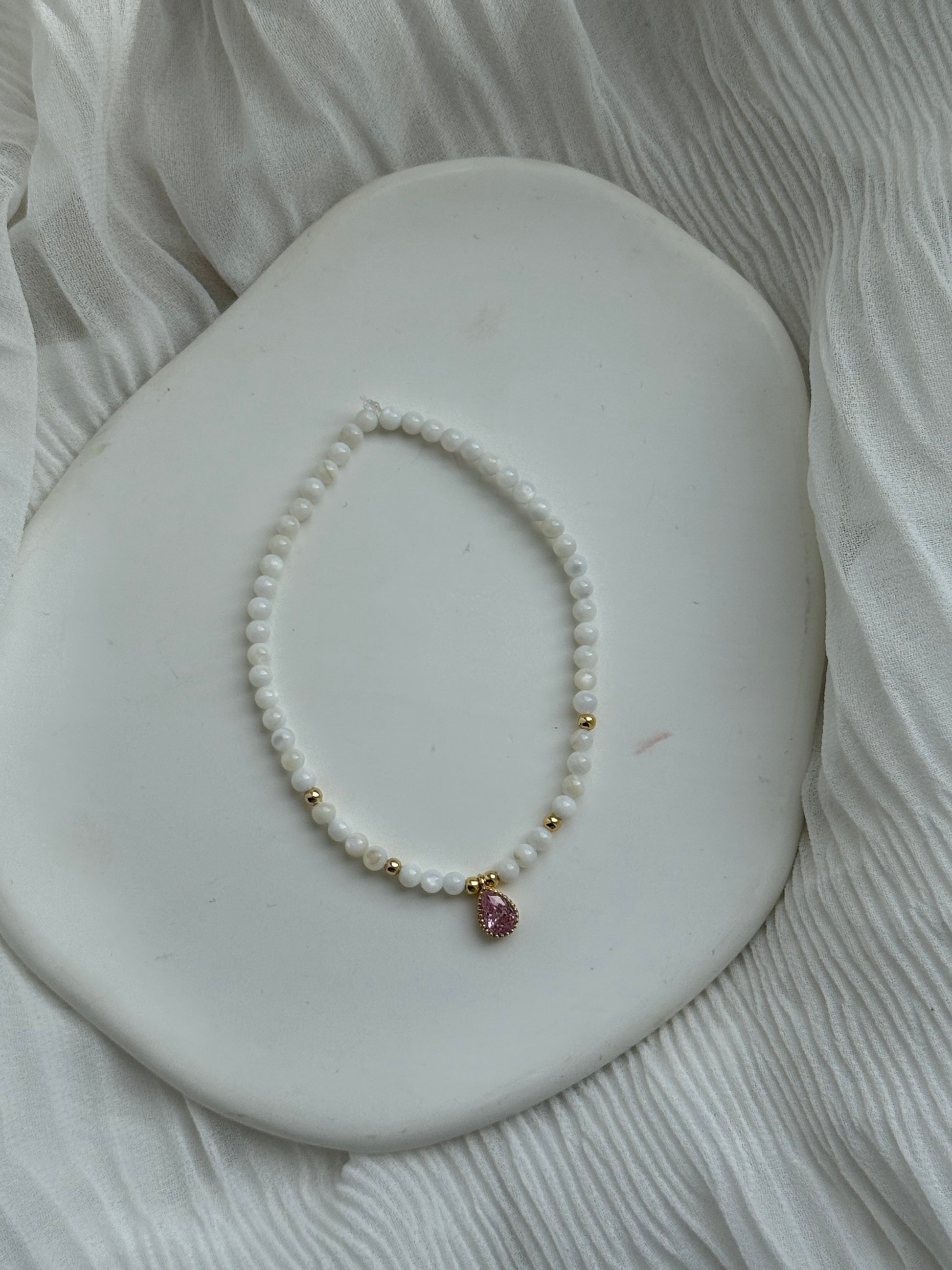 Perlenarmband mit Weißen Perlen, Goldenen Perlen + Rosa Tropfen Anhänger - 111172