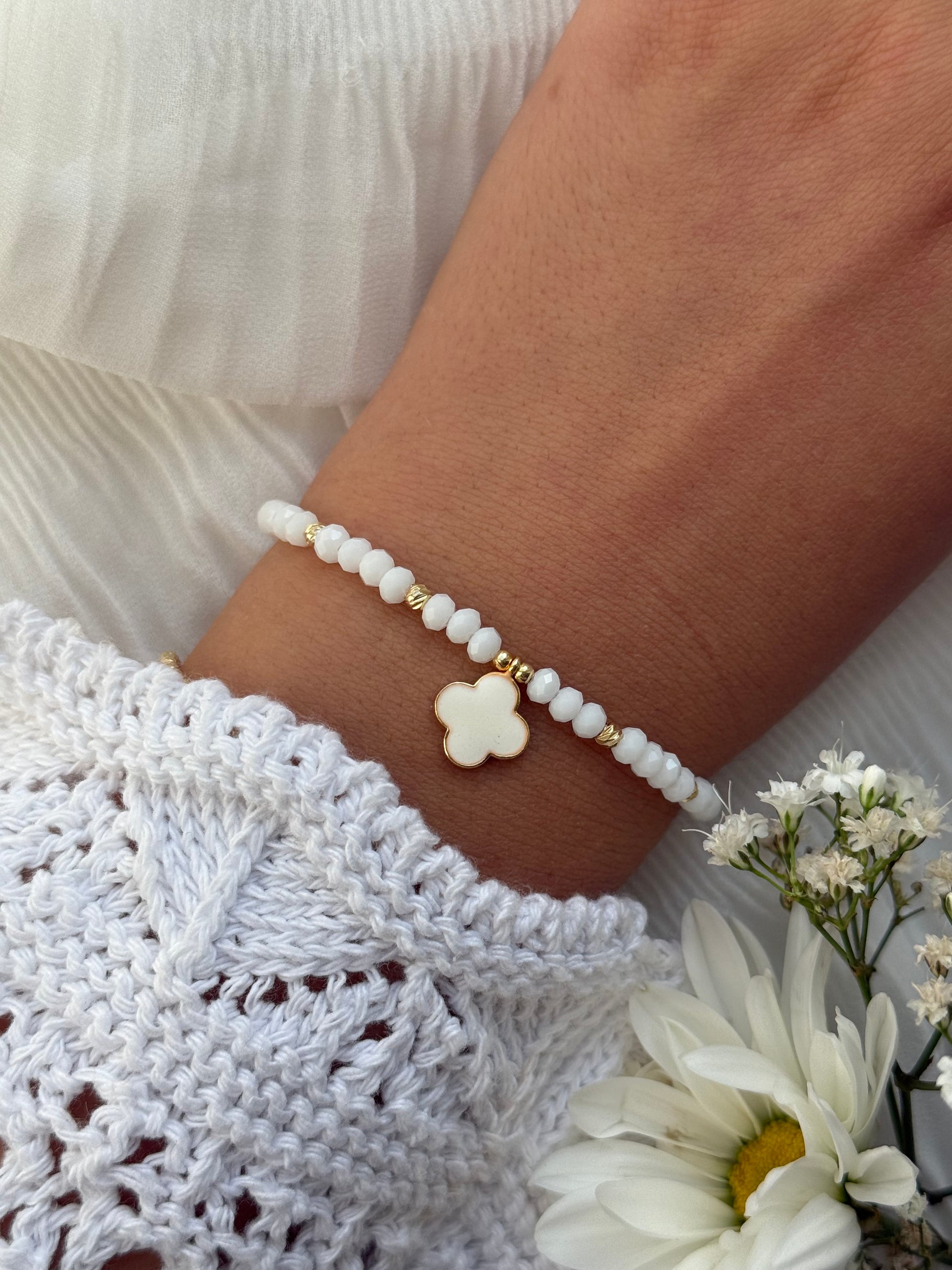 Diese Perlenarmband besteht aus Weißen und Goldenen Perlen und Kleeblatt Anhänger und stylt jedes Outfit!