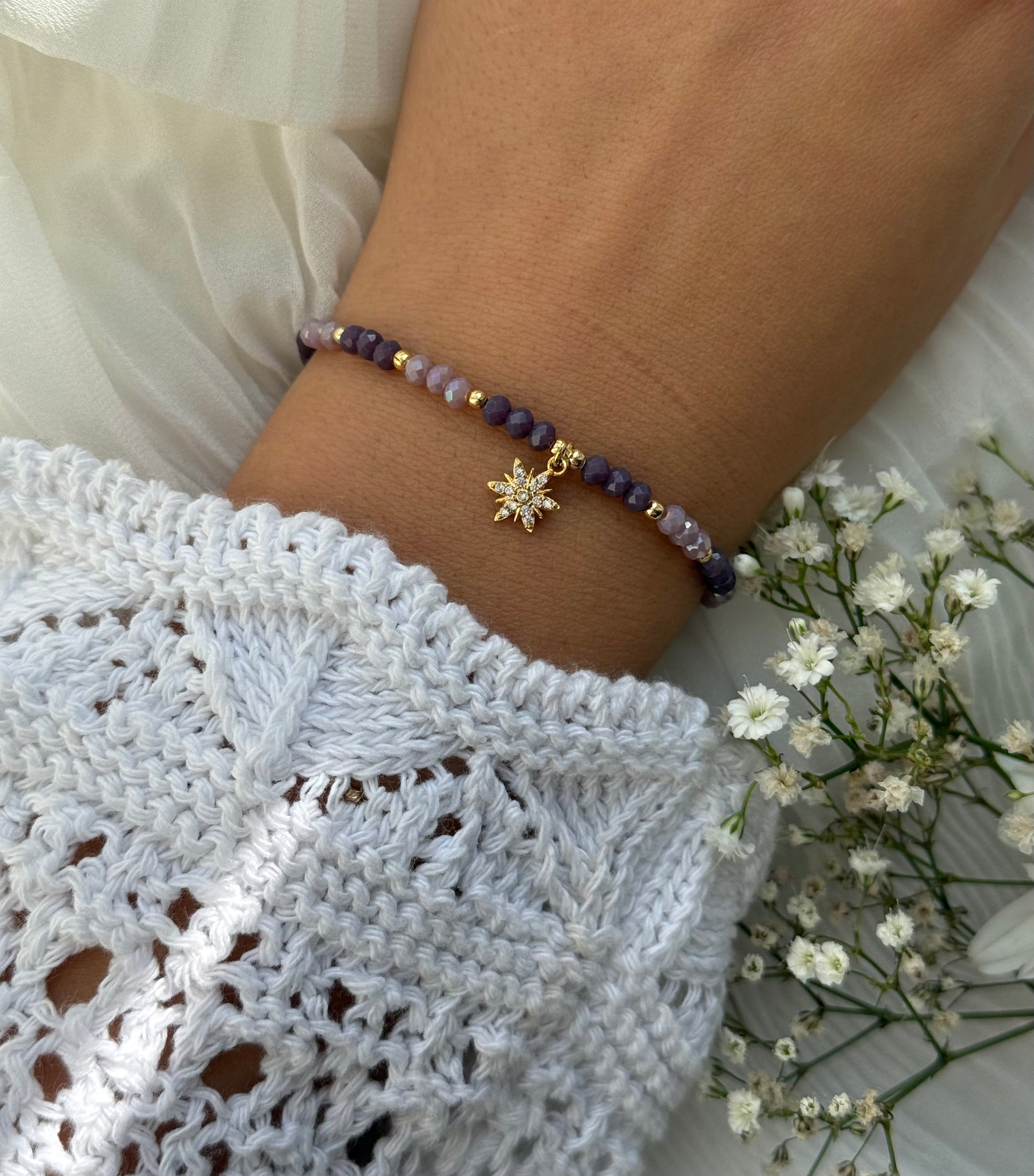 Perlenarmband mit Lila Kristallperlen, Goldenen Perlen + Stern Anhänger - 10976