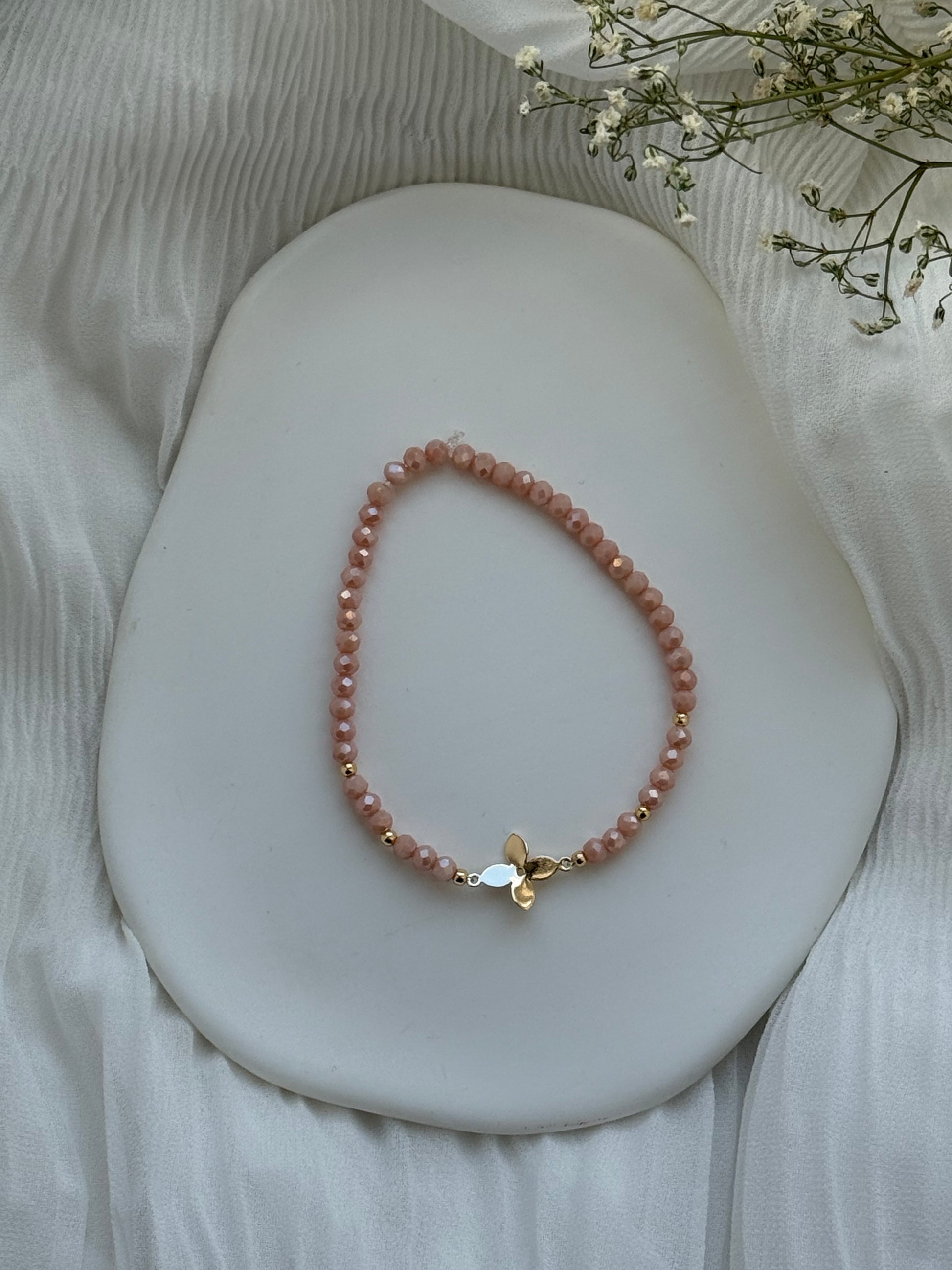 Perlenarmband mit Beigen Kristallperlen, Goldenen Perlen + Kleeblatt Anhänger - 2122