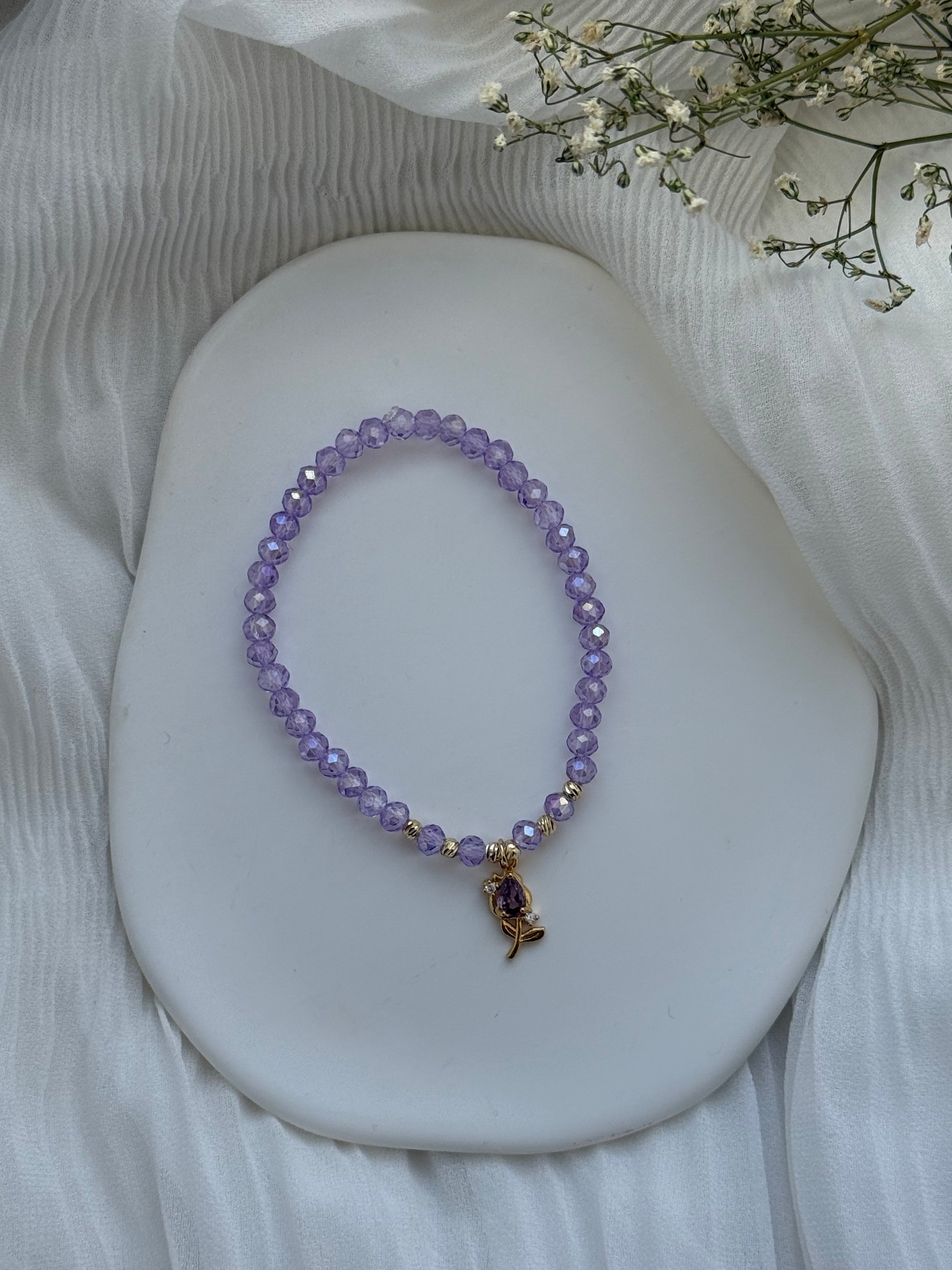 Perlenarmband mit Lila Kristallperlen, Goldenen Perlen + Tulpen Anhänger - 2120