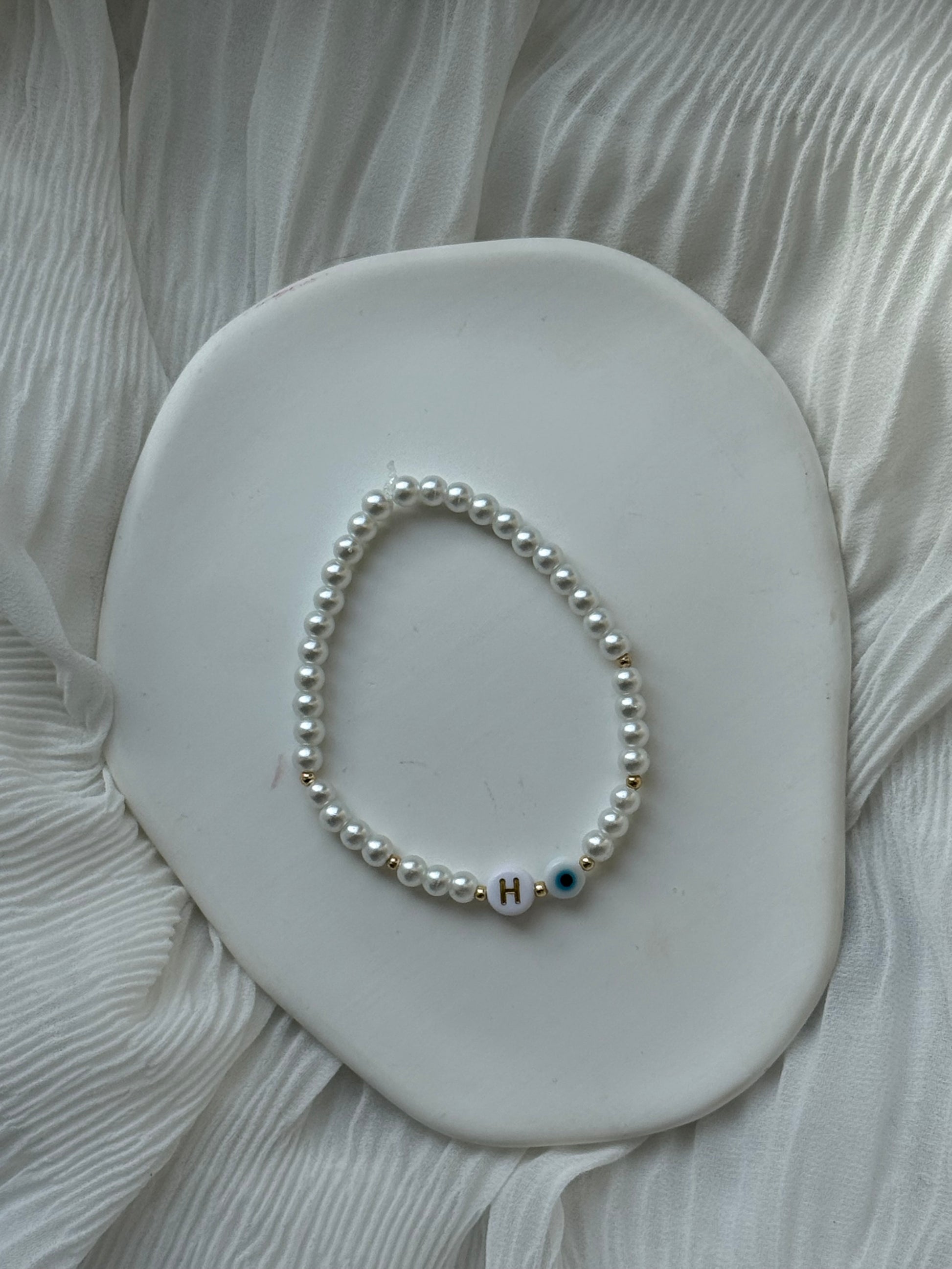 Diese Perlenarmband besteht aus Weißen und Goldenen Perlen und Nazar Anhänger und stylt jedes Outfit!