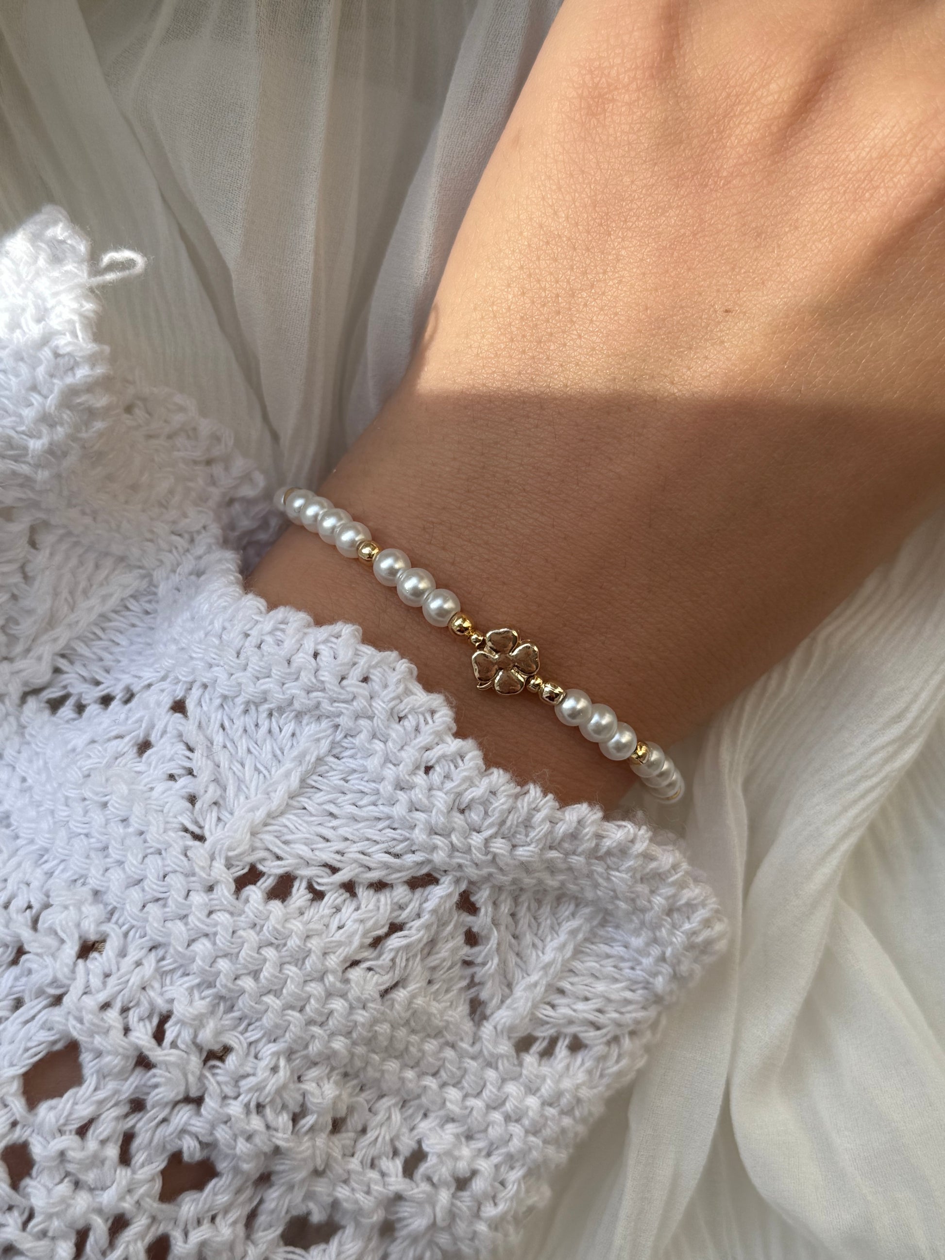 Diese Perlenarmband besteht aus Weißen und Goldenen Perlen und Kleeblatt Anhänger und stylt jedes Outfit!