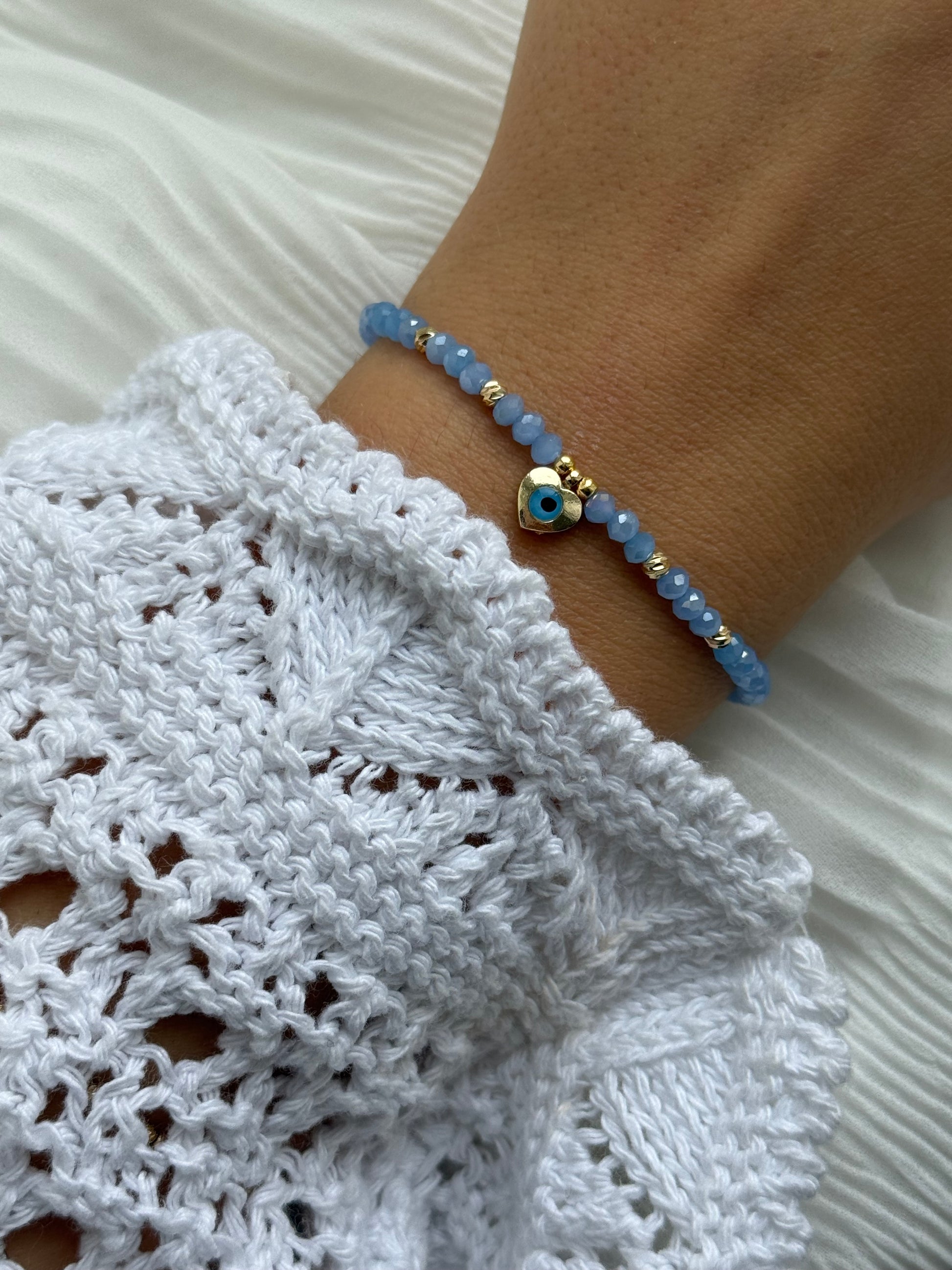 Perlenarmband mit Blauen Kristallperlen, Goldenen Details + Nazar Herz Anhänger - 111185