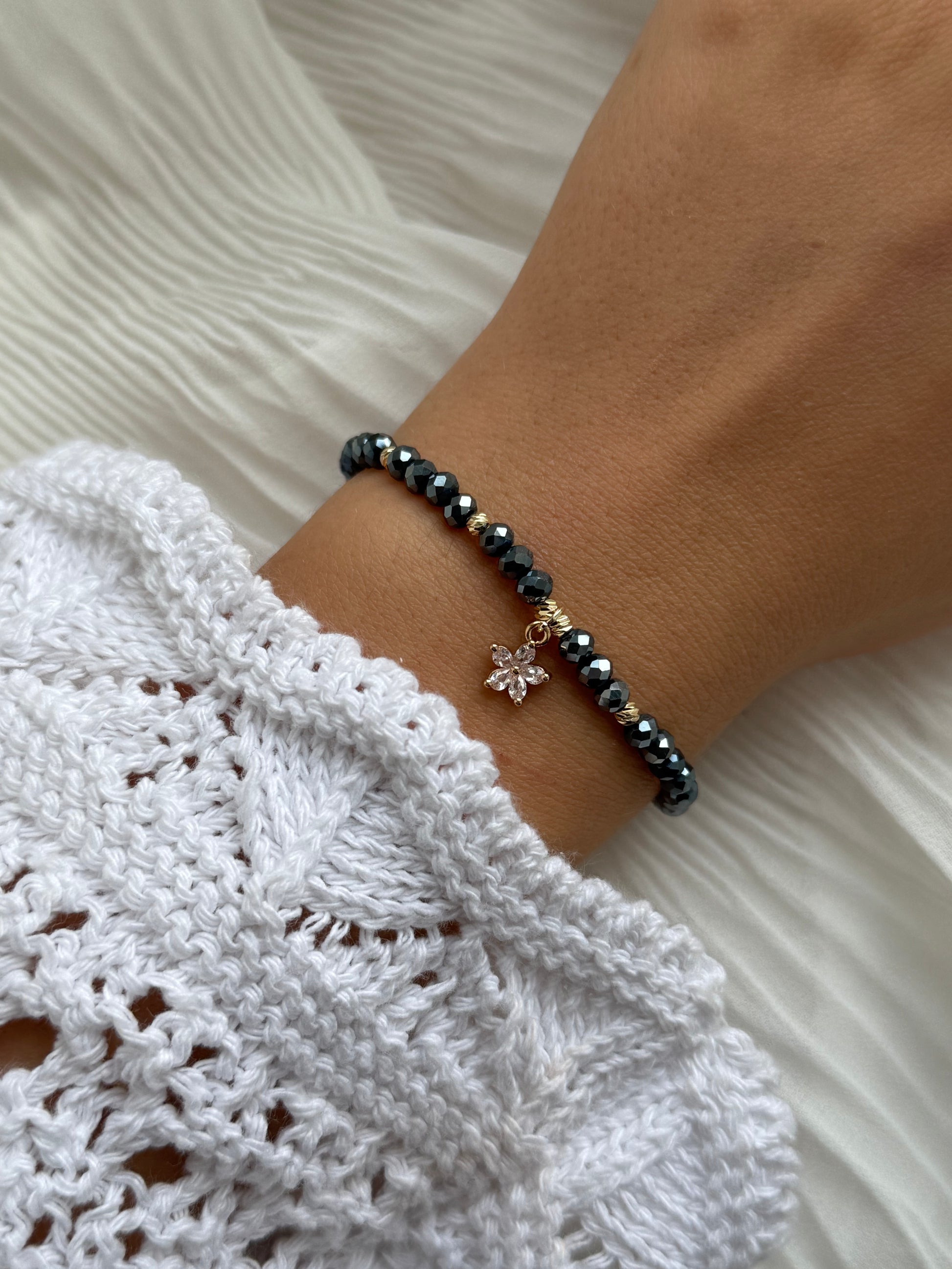 Perlenarmband mit Dunkelblauen Kristallperlen, Goldenen Perlen + Blumen Anhänger - 111179
