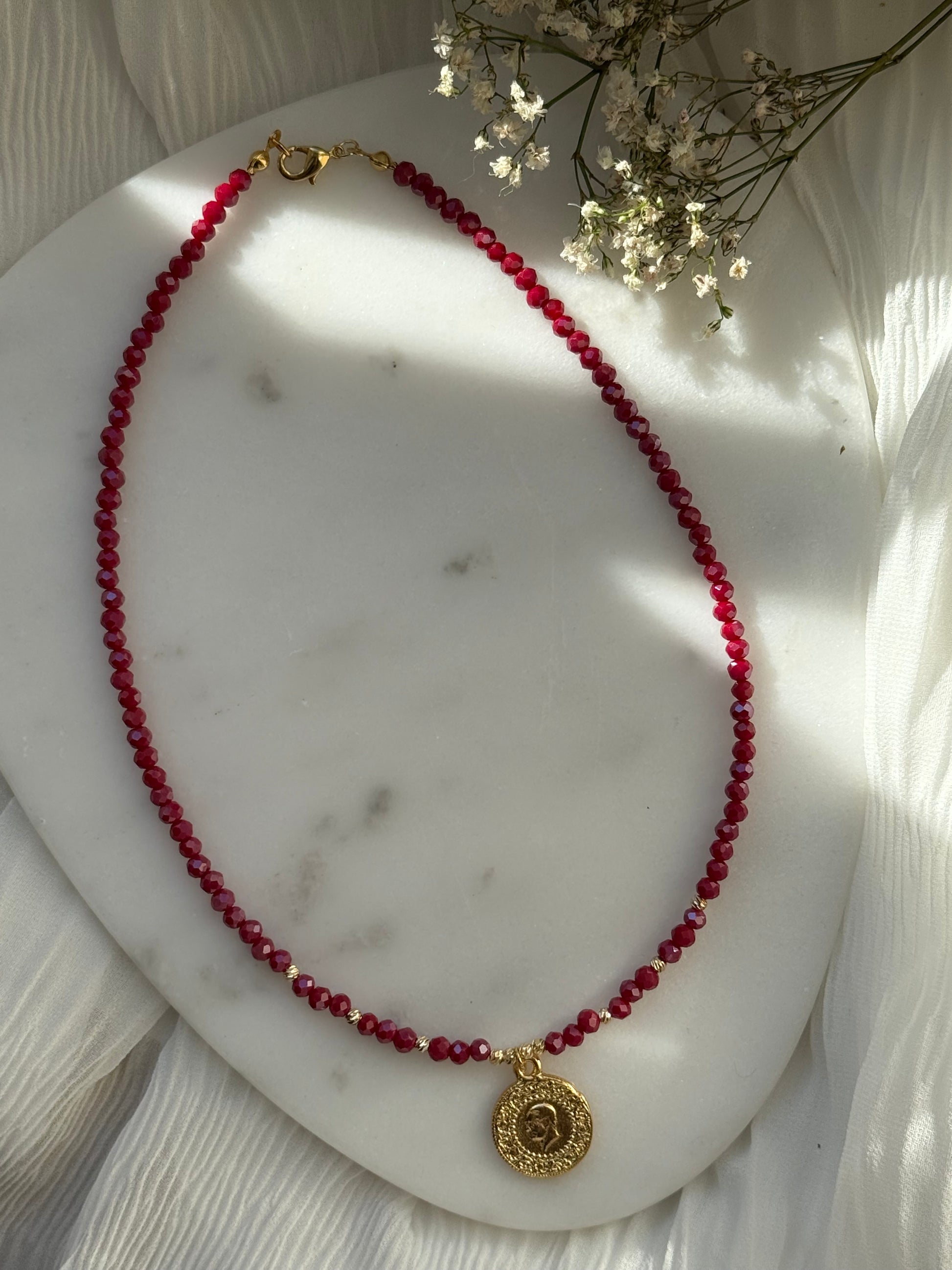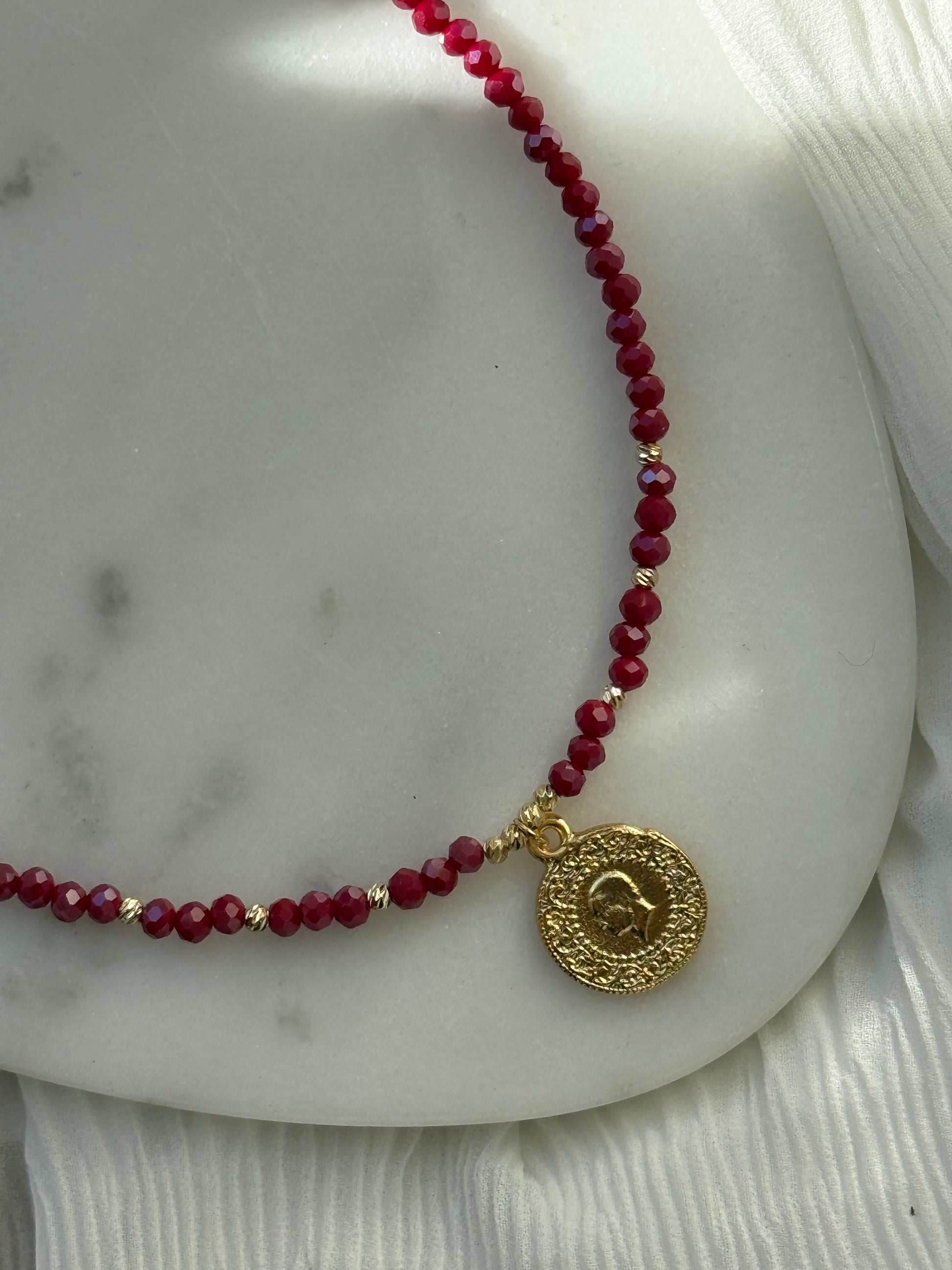 Perlenkette mit Roten, Kristallperlen und Goldenen Perlen + Ceyrek Anhänger - 11027