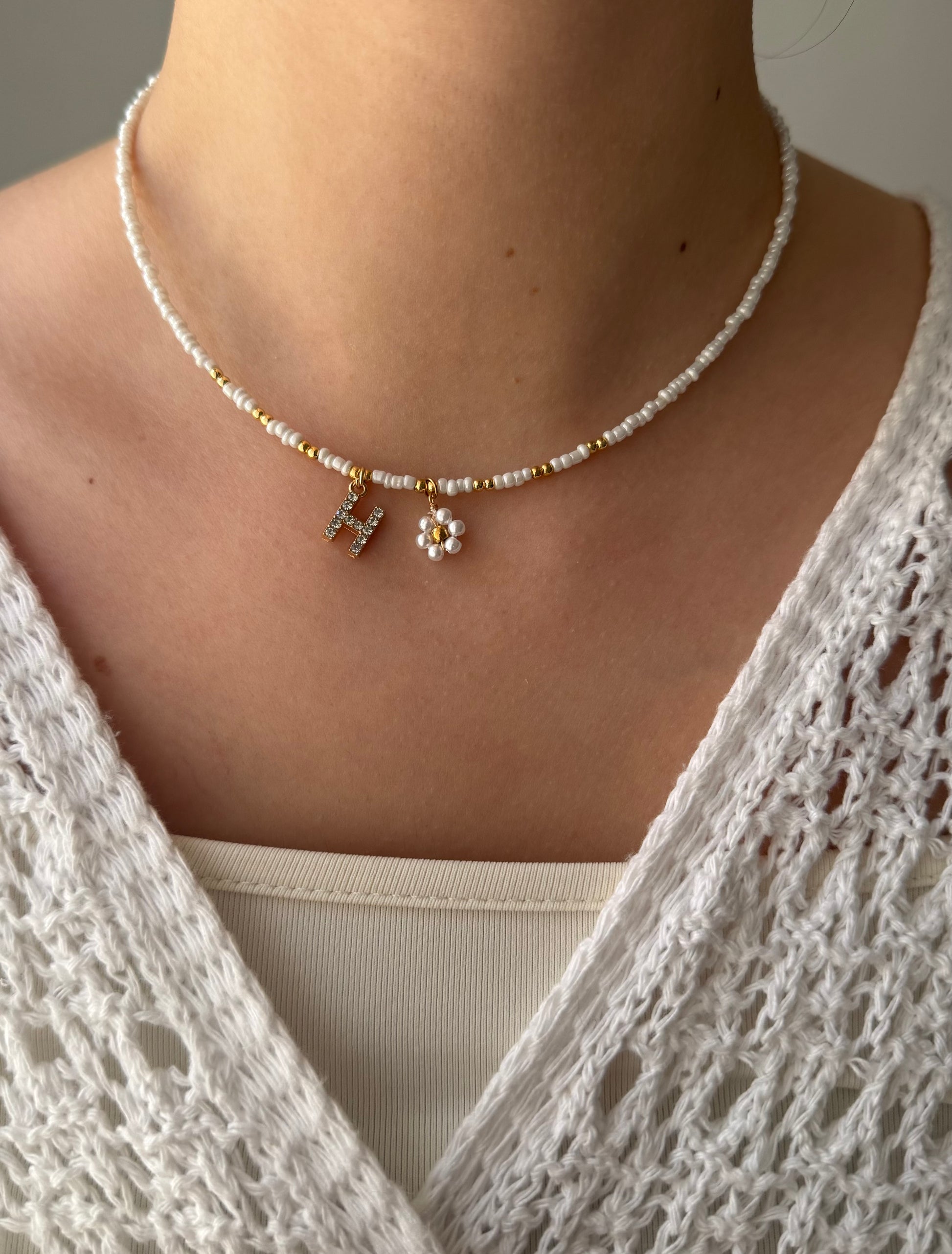 Perlenkette personalisiert mit Weißen Perlen, Goldenen Perlen + Blumen Anhänger - 2160