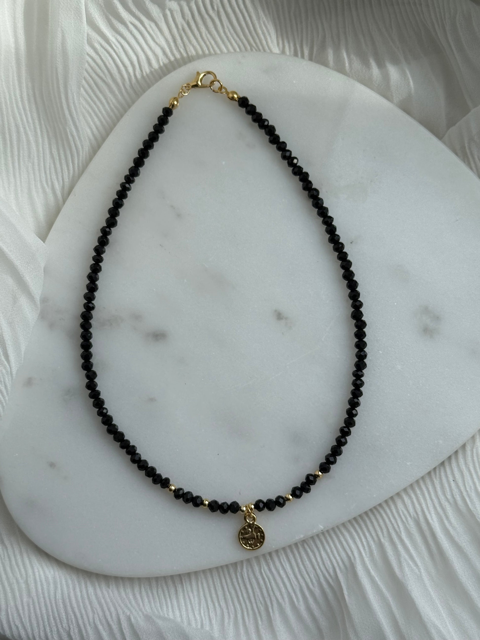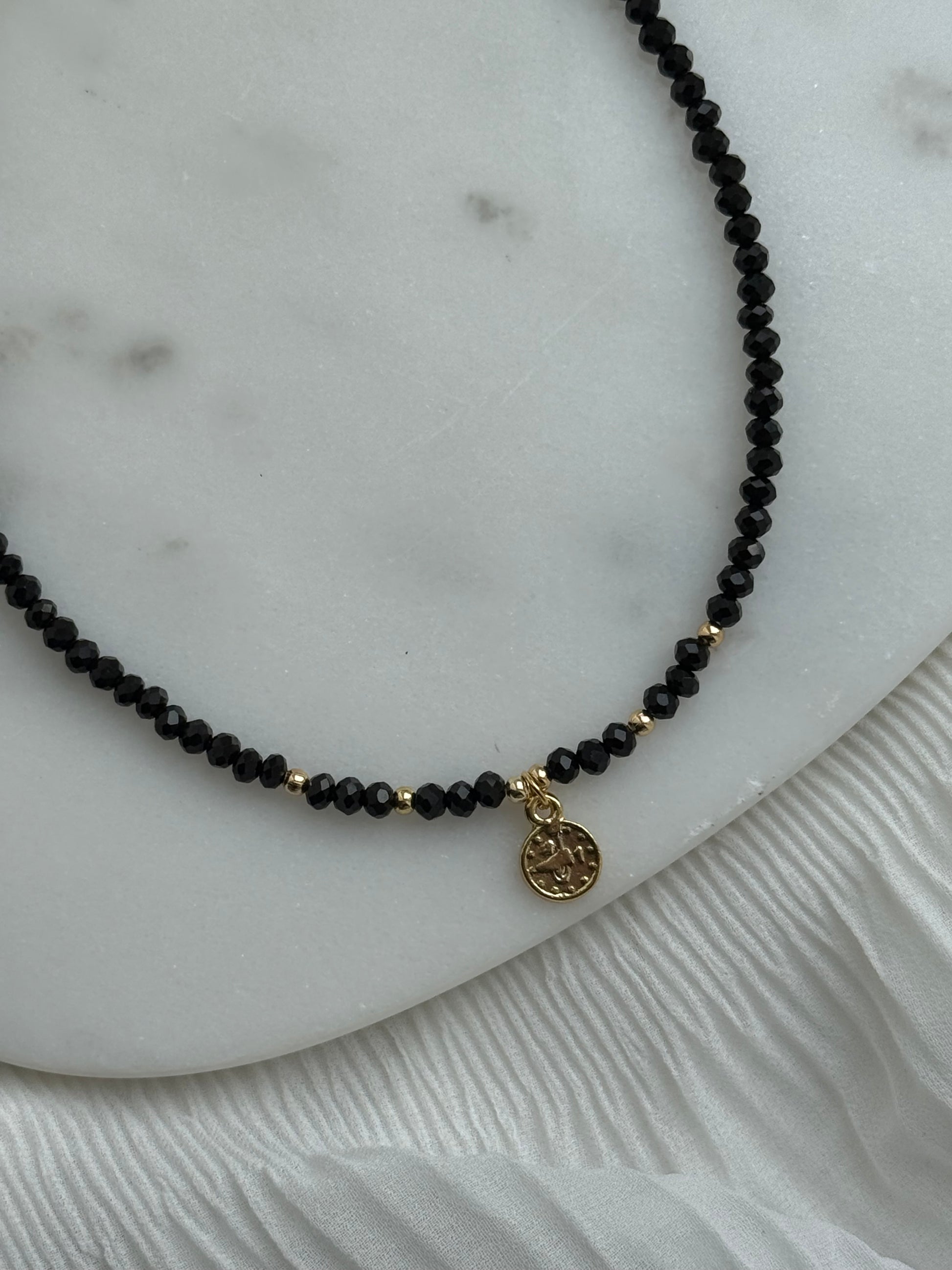 Perlenkette mit Schwarzen Kristallperlen, Goldenen Details + Taler Anhänger - 111162