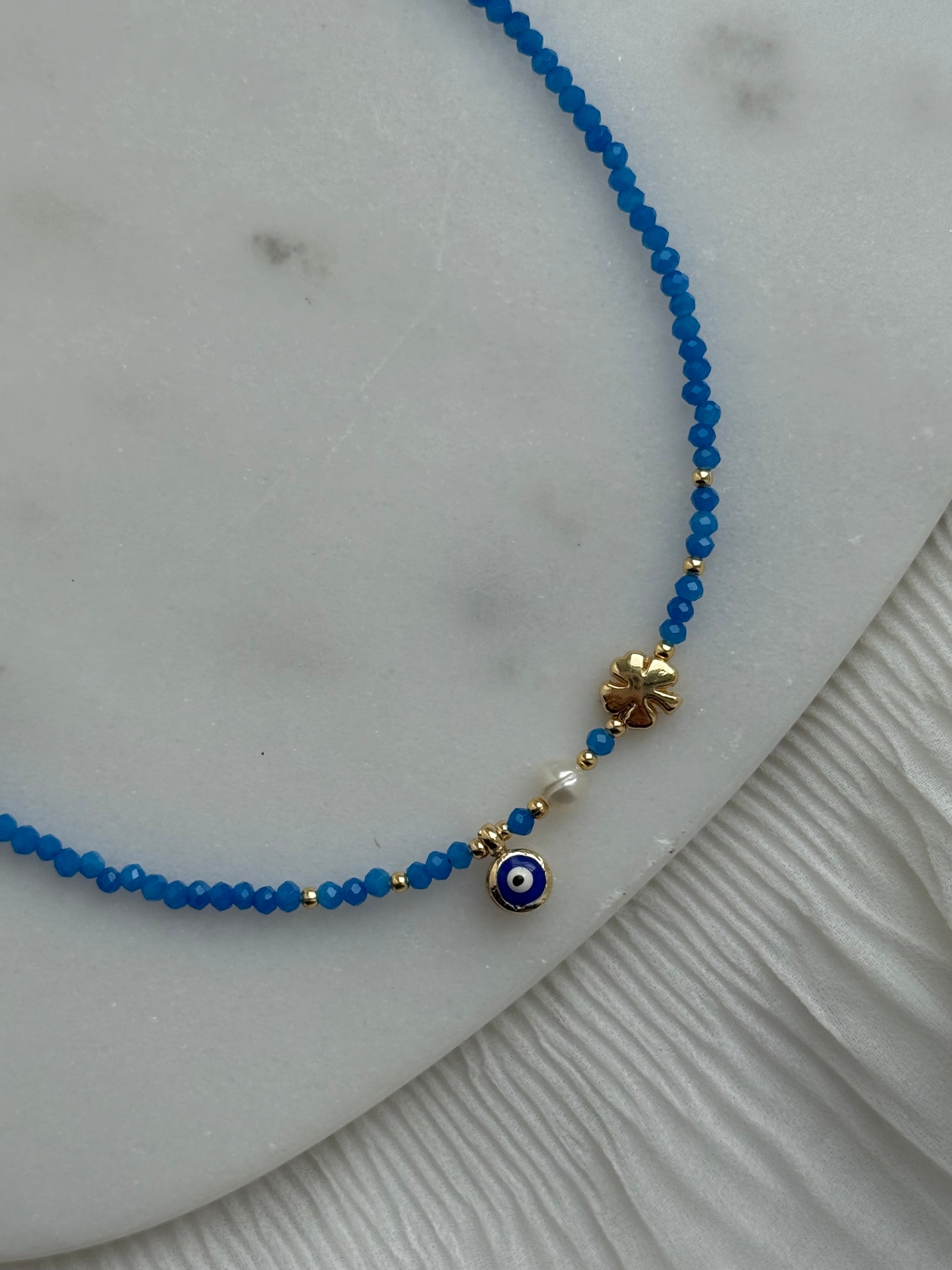 Perlenkette mit Blauen Kristallperlen, Goldenen Details + Nazar, Kleeblatt Anhänger - 111166