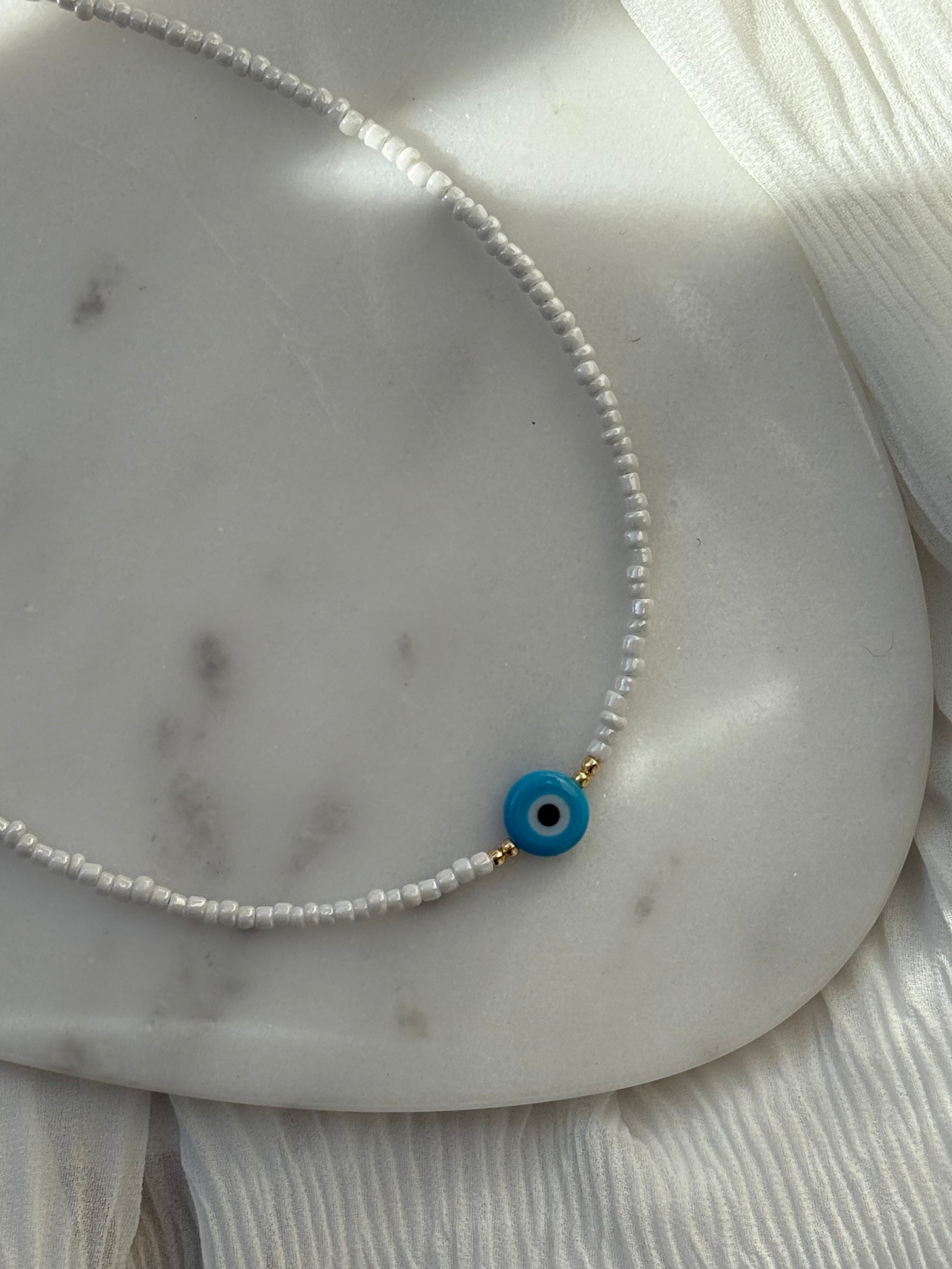 Diese Perlenkette besteht aus Weißen und Goldenen Perlen und Nazar Anhänger und stylt jedes Outfit auf!