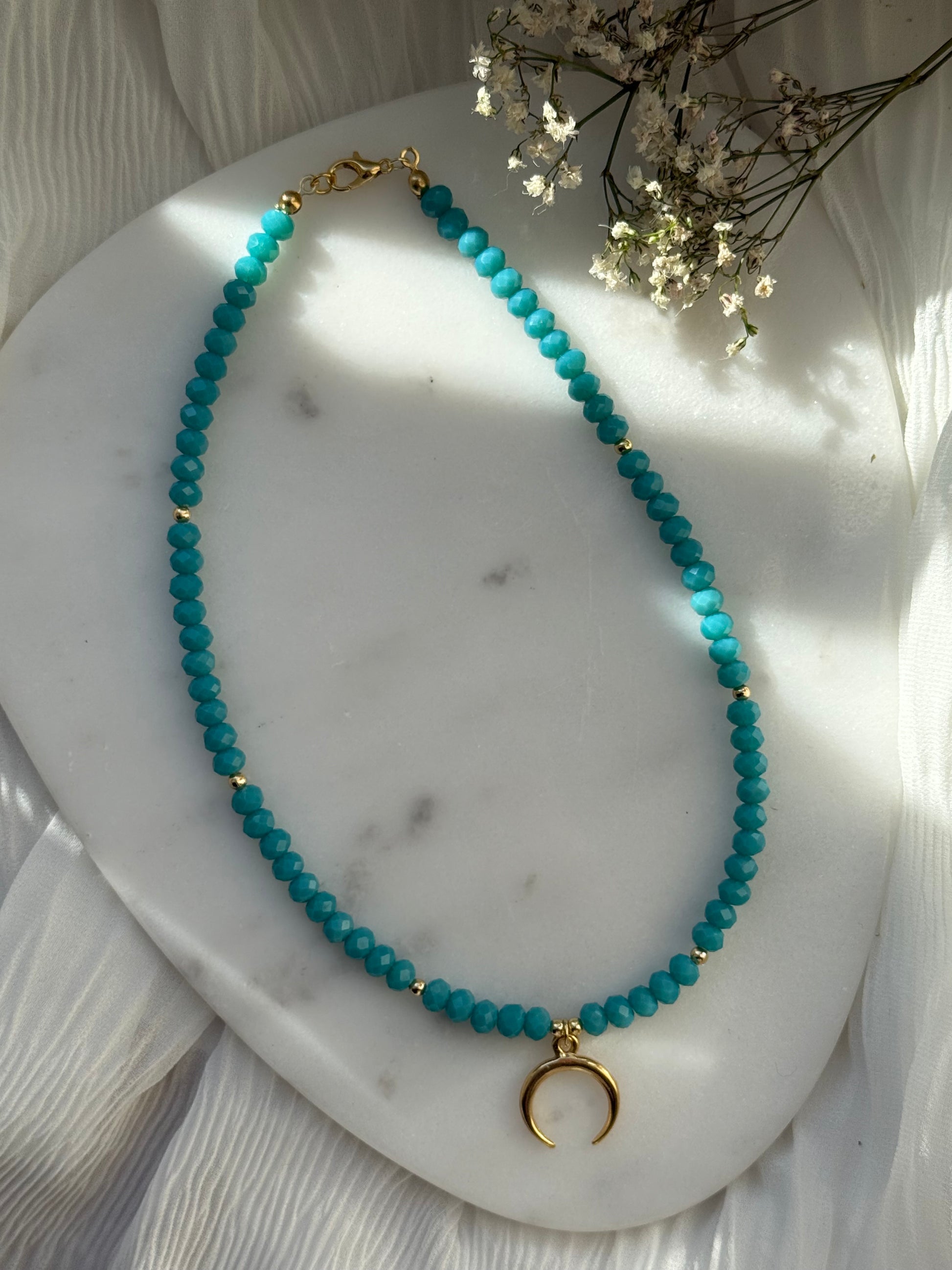 Perlenkette mit Türkisen Kristallperlen und Goldenen Perlen + Mond Anhänger - 11005