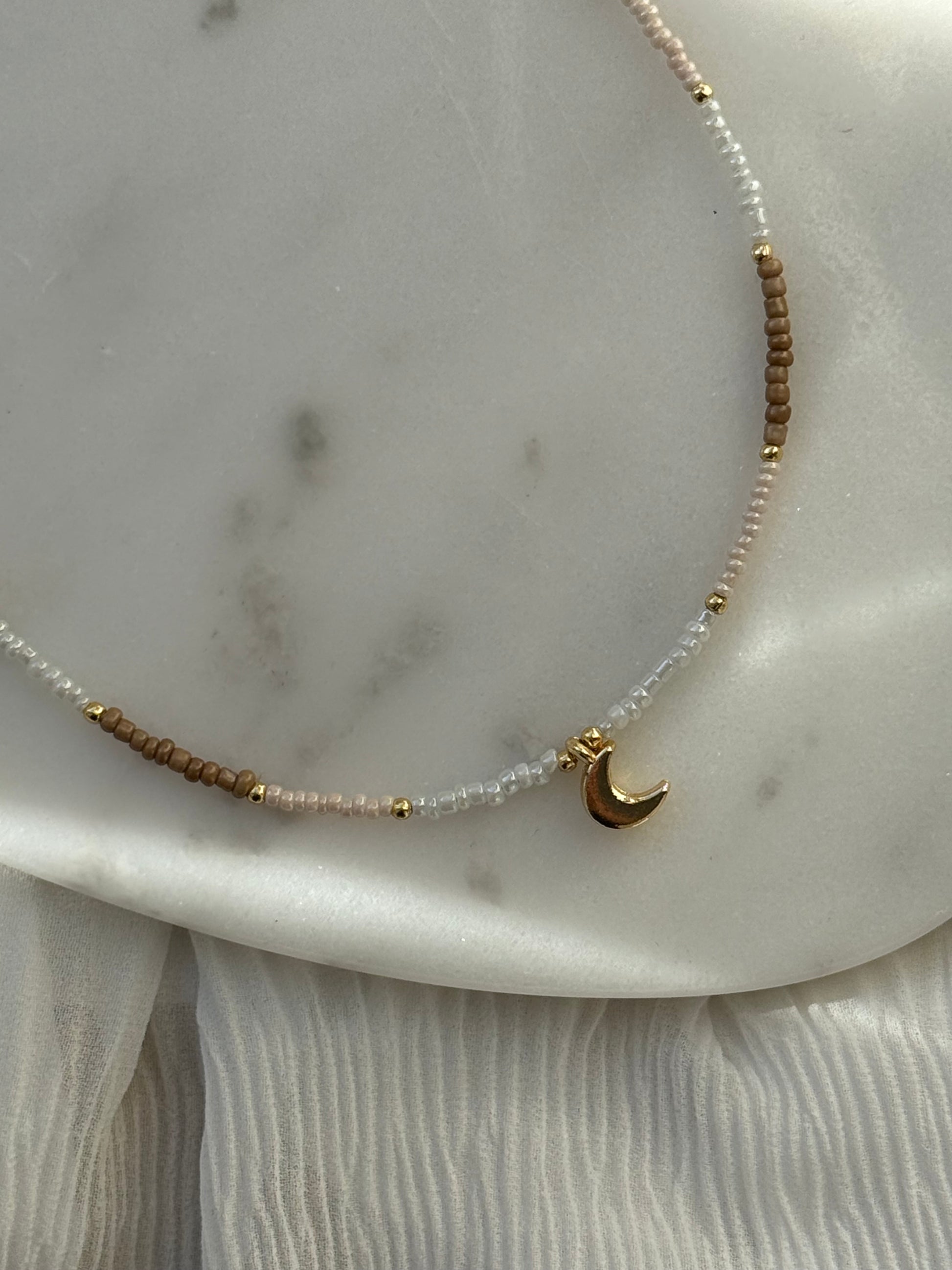 Perlenkette mit Beigen / Braunen / Weißen Perlen und Goldenen Perlen + Mond Anhänger - 11159