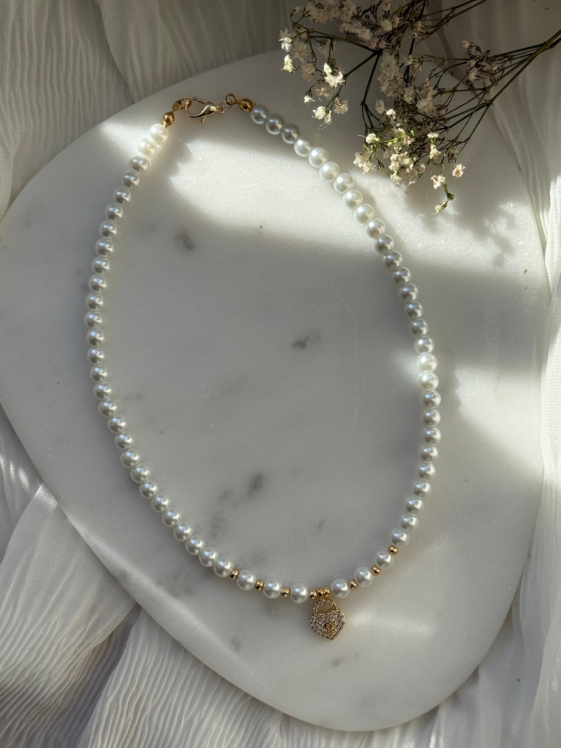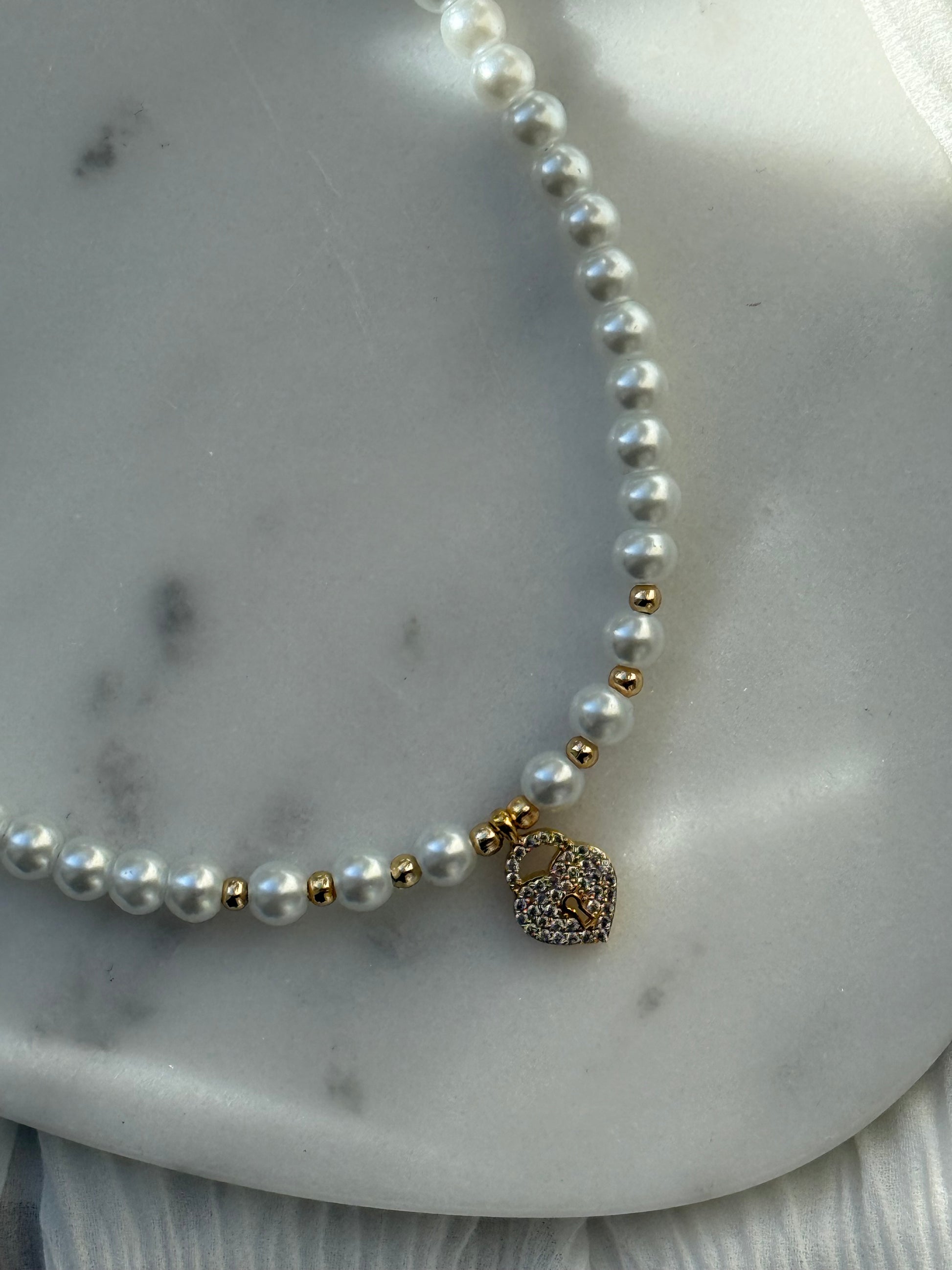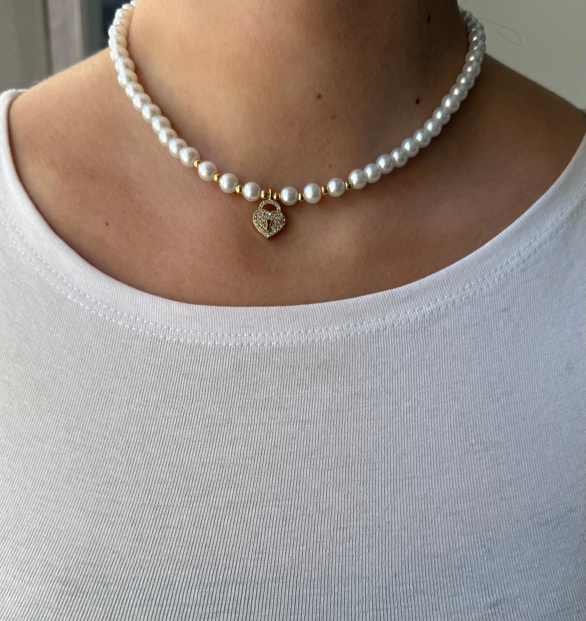 Perlenkette mit Weißen Perlen und Goldenen Perlen + Herz Anhänger - 11004
