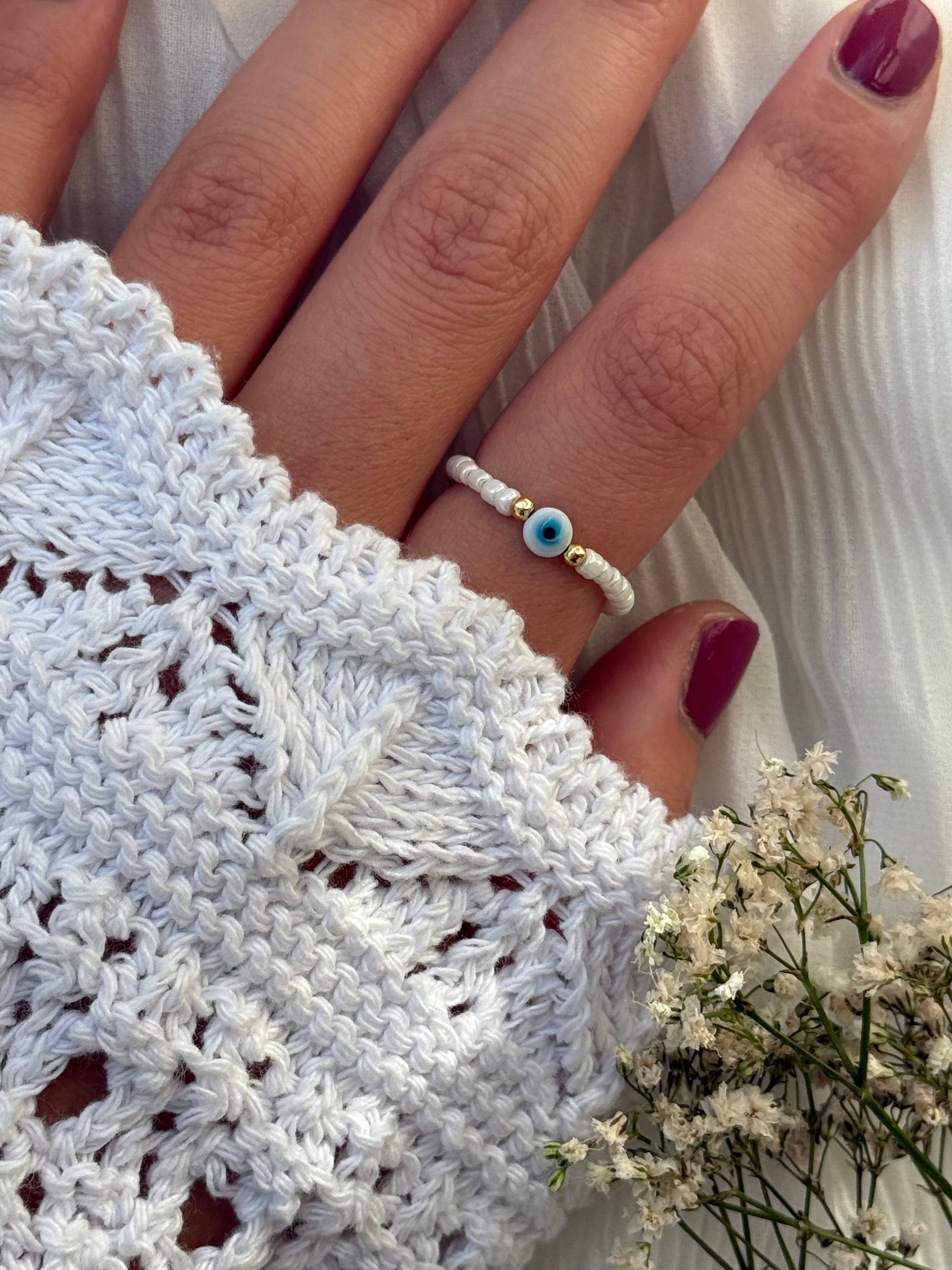 Dieser Perlenring besteht aus Weißen Perlen und Goldenen Perlen und Nazar Perle und stylt jedes Outfit auf!