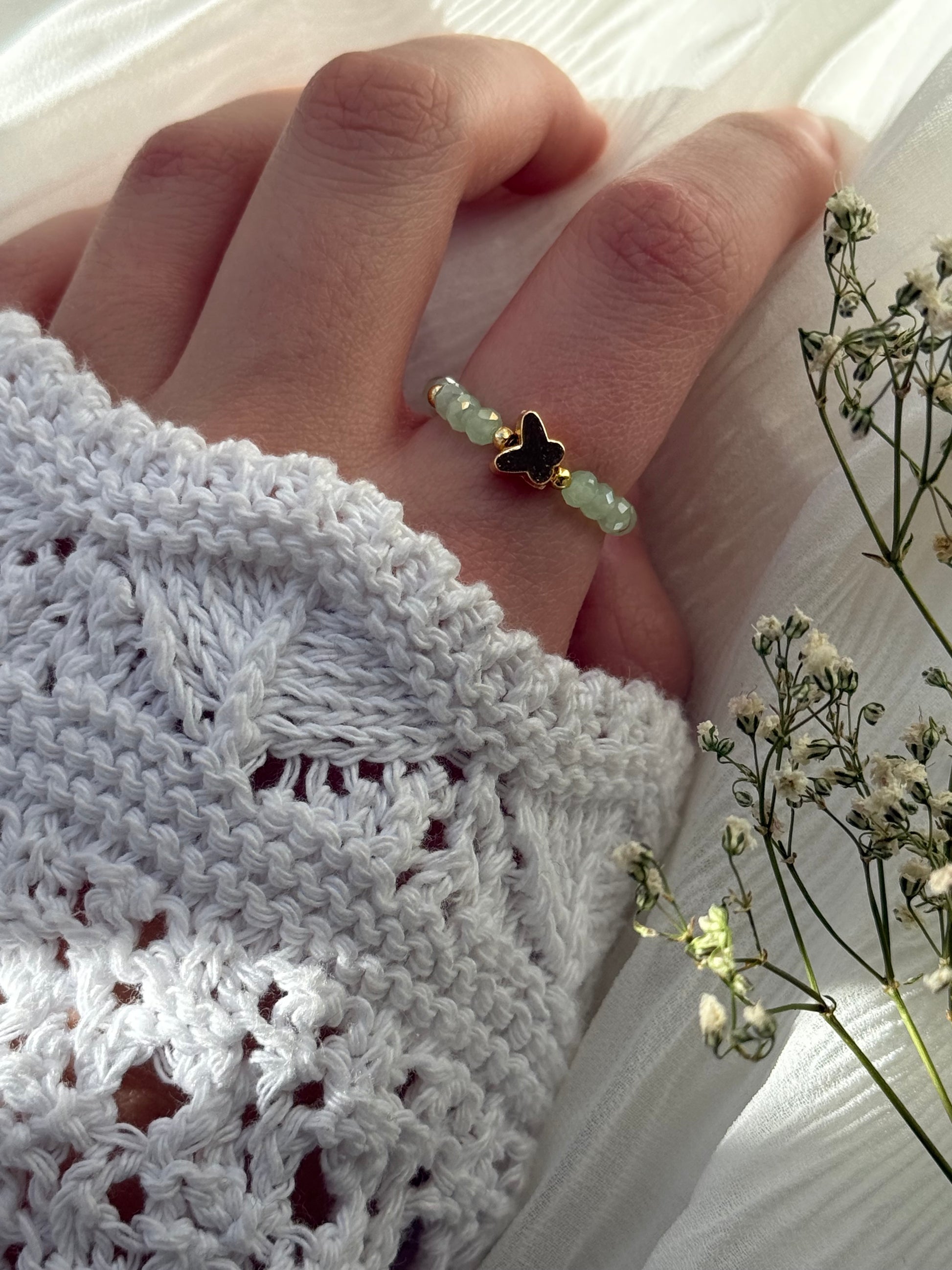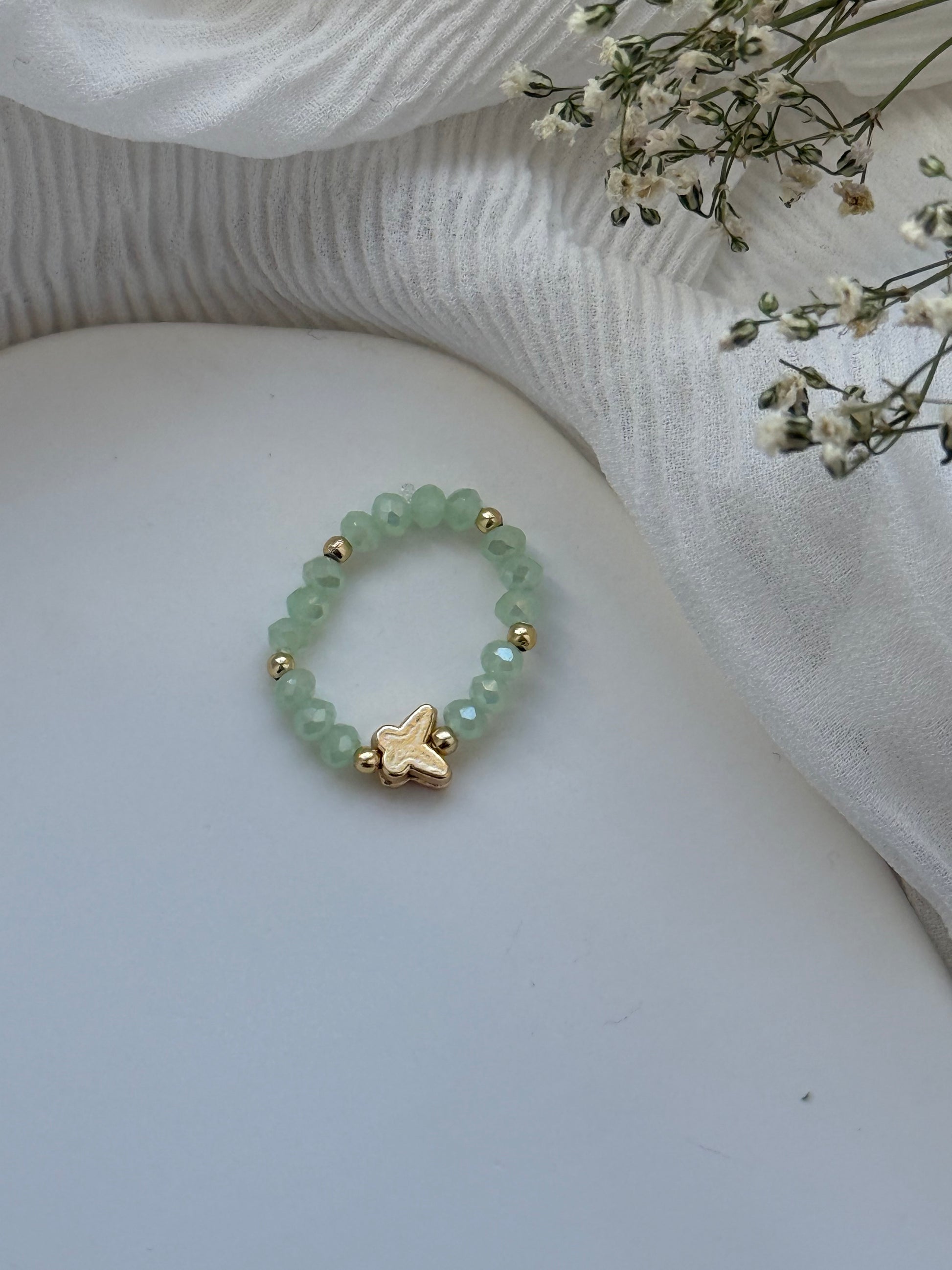 Dieser Perlenring besteht aus Grünen perlen + Schmetterling Anhänger und stylt jedes Outfit auf!