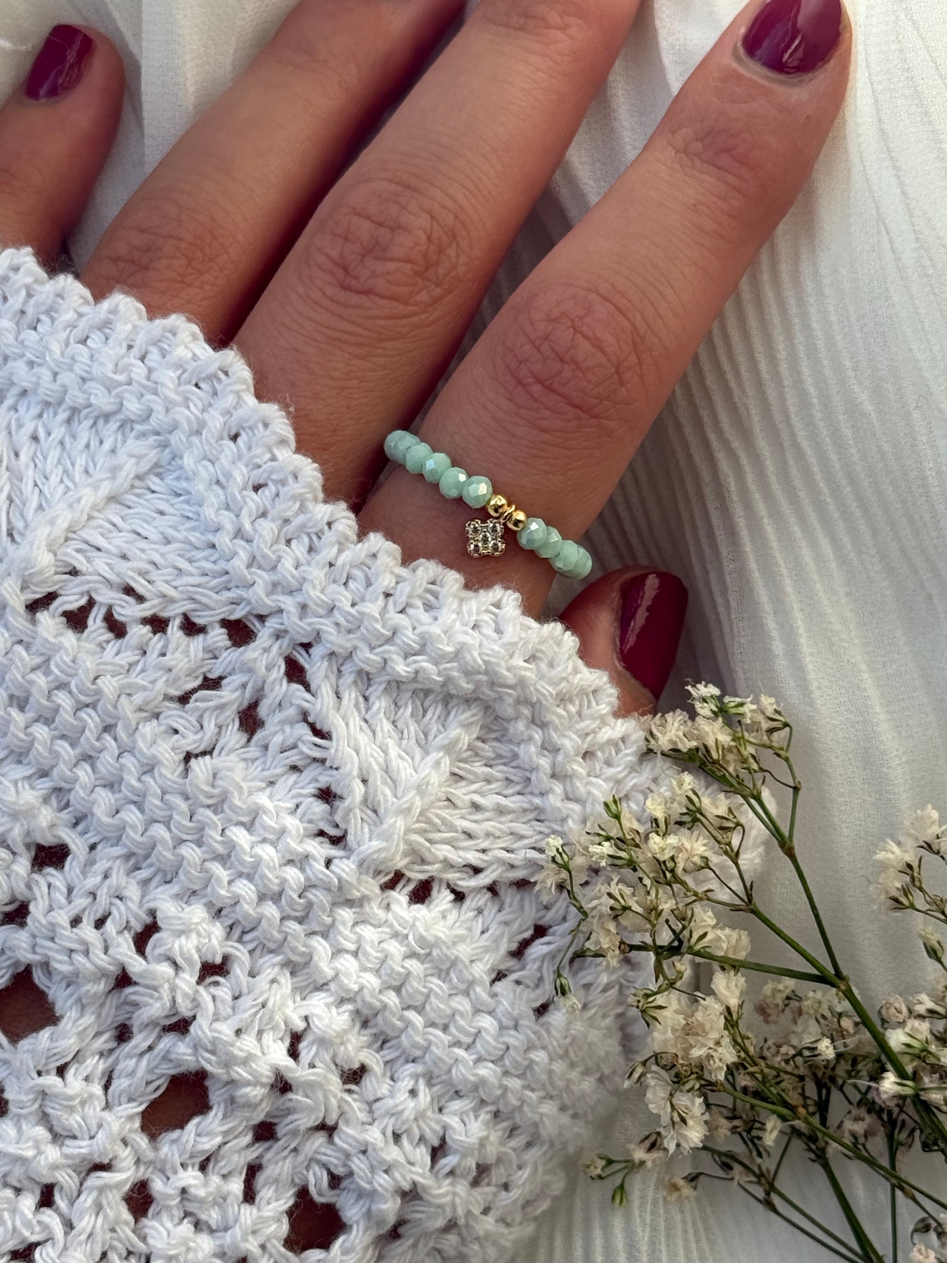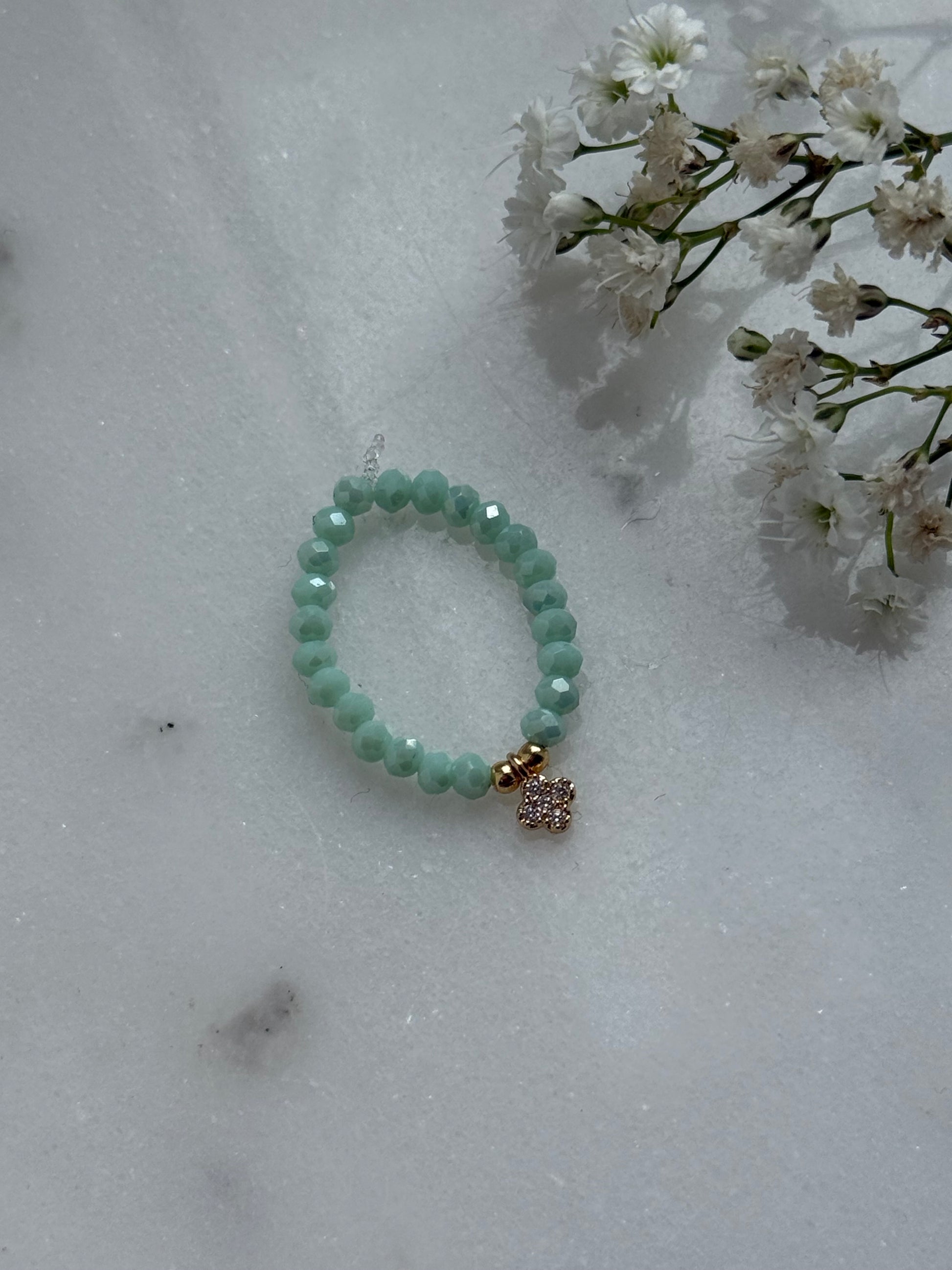 Perlenring mit Grünen Kristallperlen, Goldenen Details + Kleeblatt Anhänger - 11000