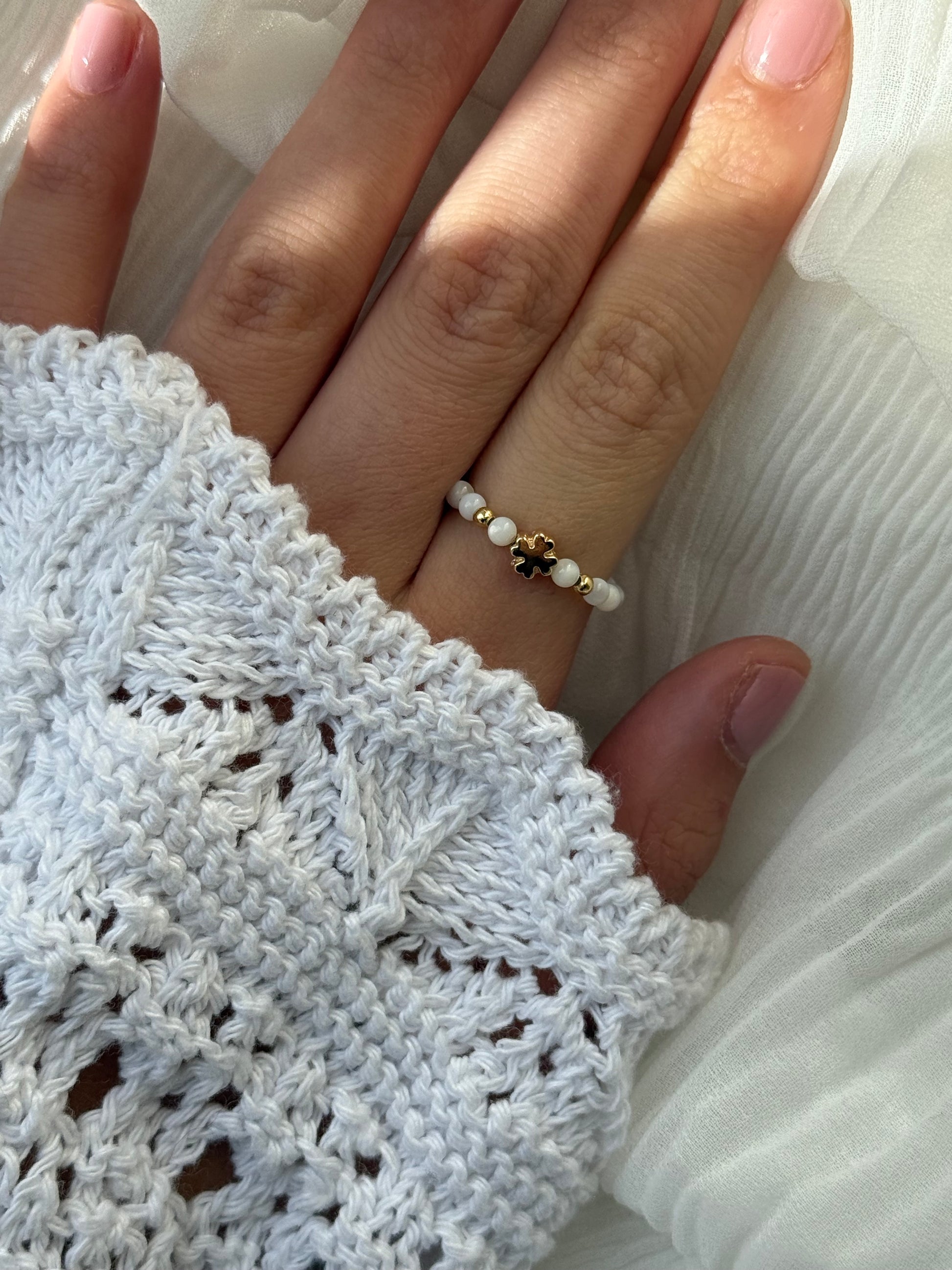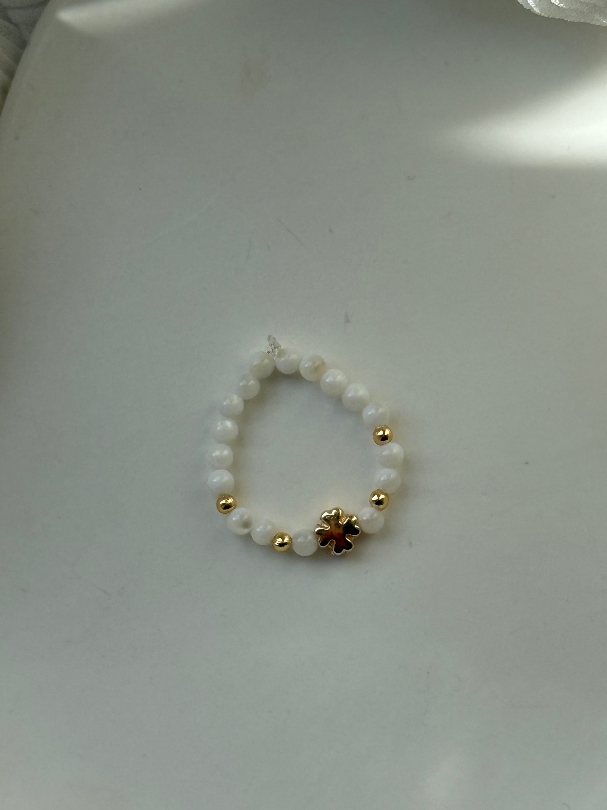 Dieser Perlenring besteht aus Weißen Perlen und Goldenen Perlen und Kleeblatt Anhänger und stylt jedes Outfit auf!
