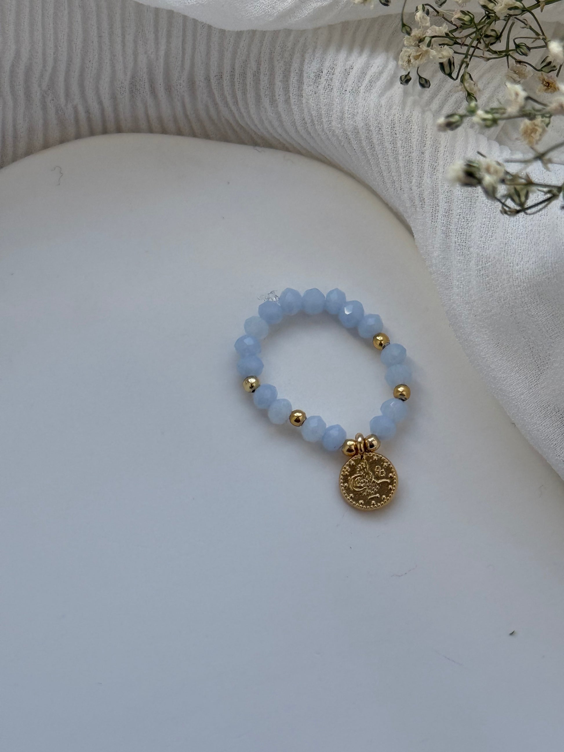 Perlenring mit Hellblauen Kristallperlen, goldenen Perlen + goldene Taler Anhänger - 2149