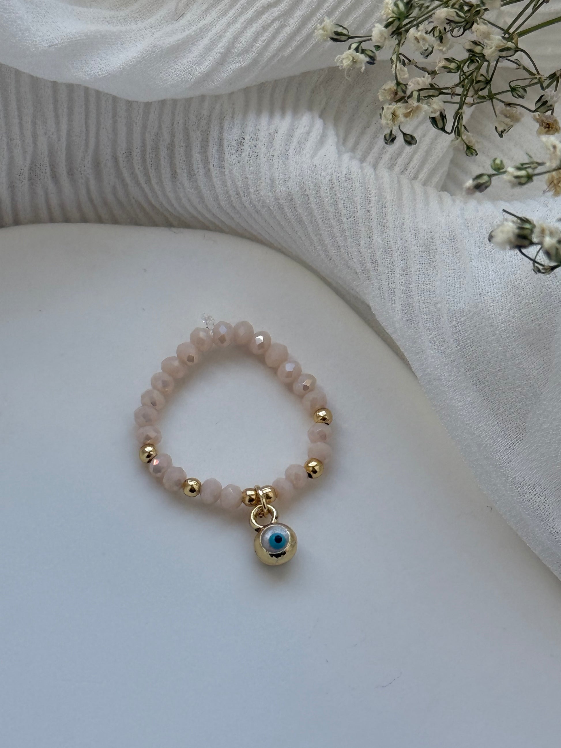 Perlenring mit Beigen Kristallperlen und Goldenen Details + Nazar Anhänger - 2136