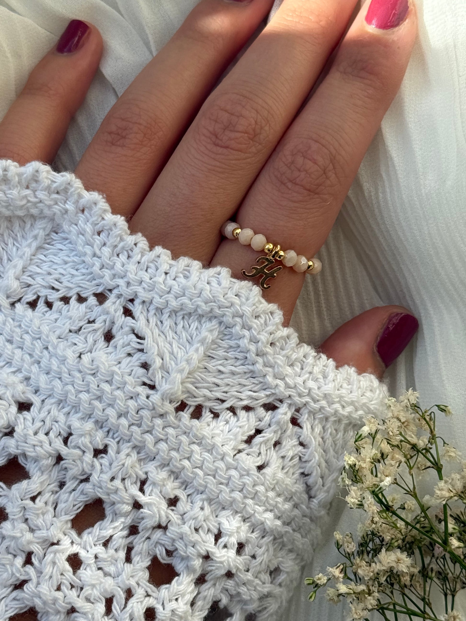 Dieser Perlenring besteht aus Beigen Perlen und Goldenen Perlen und einem Buchstaben Anhänger und stylt jedes Outfit auf!