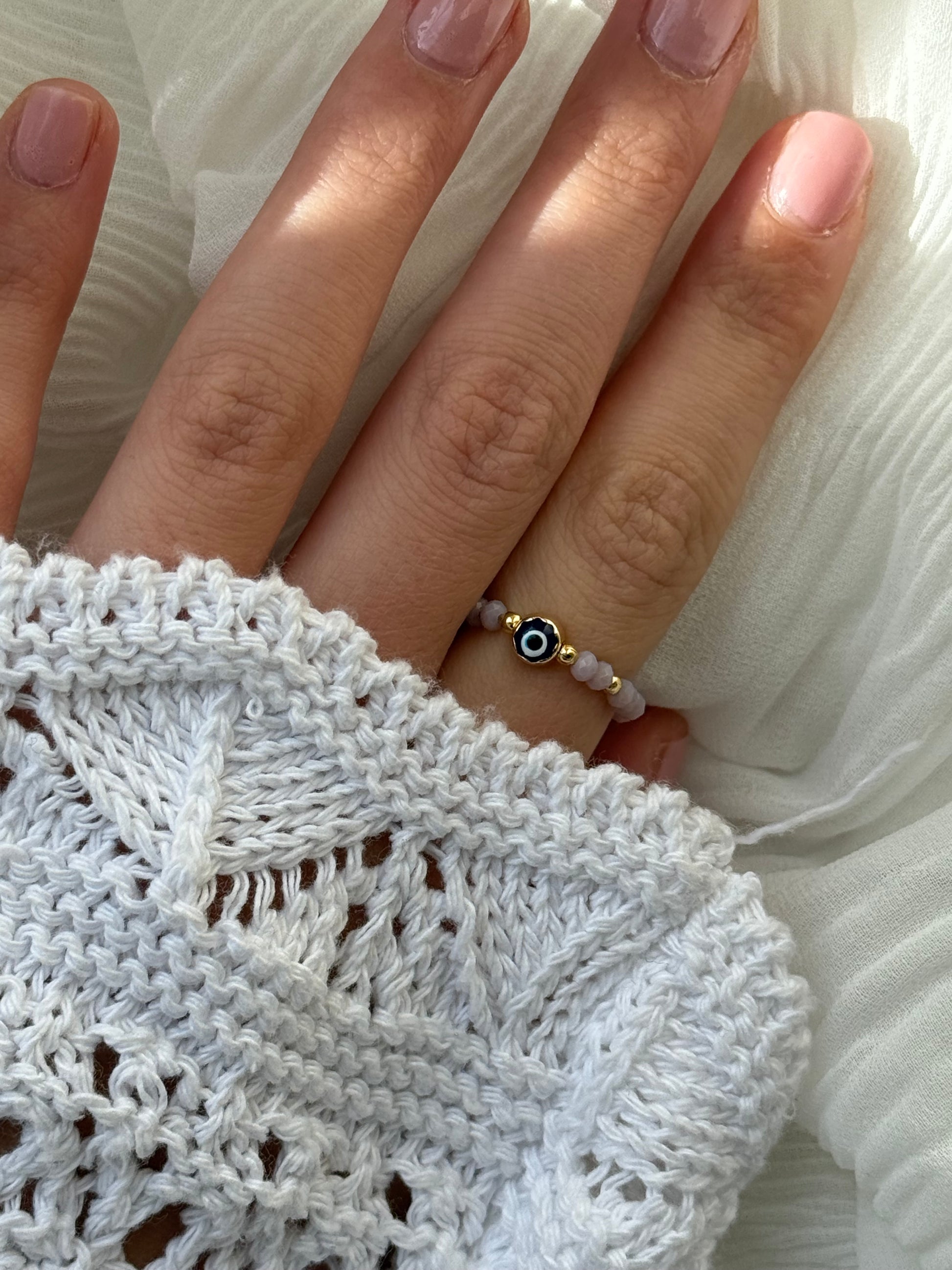 Perlenring mit Flieder Kristallperlen, Goldenen Details + Nazar, Evil eye Anhänger - 111198