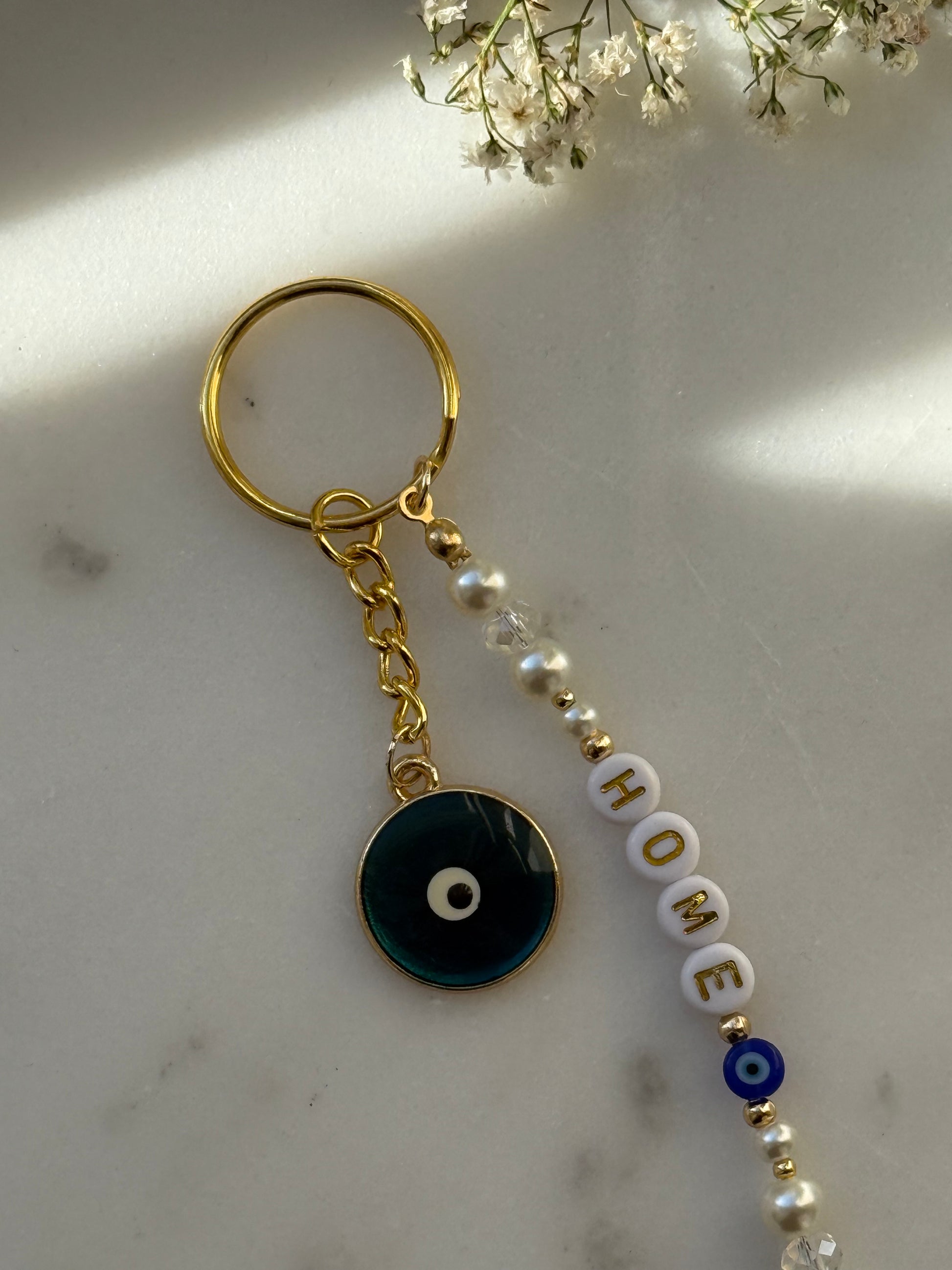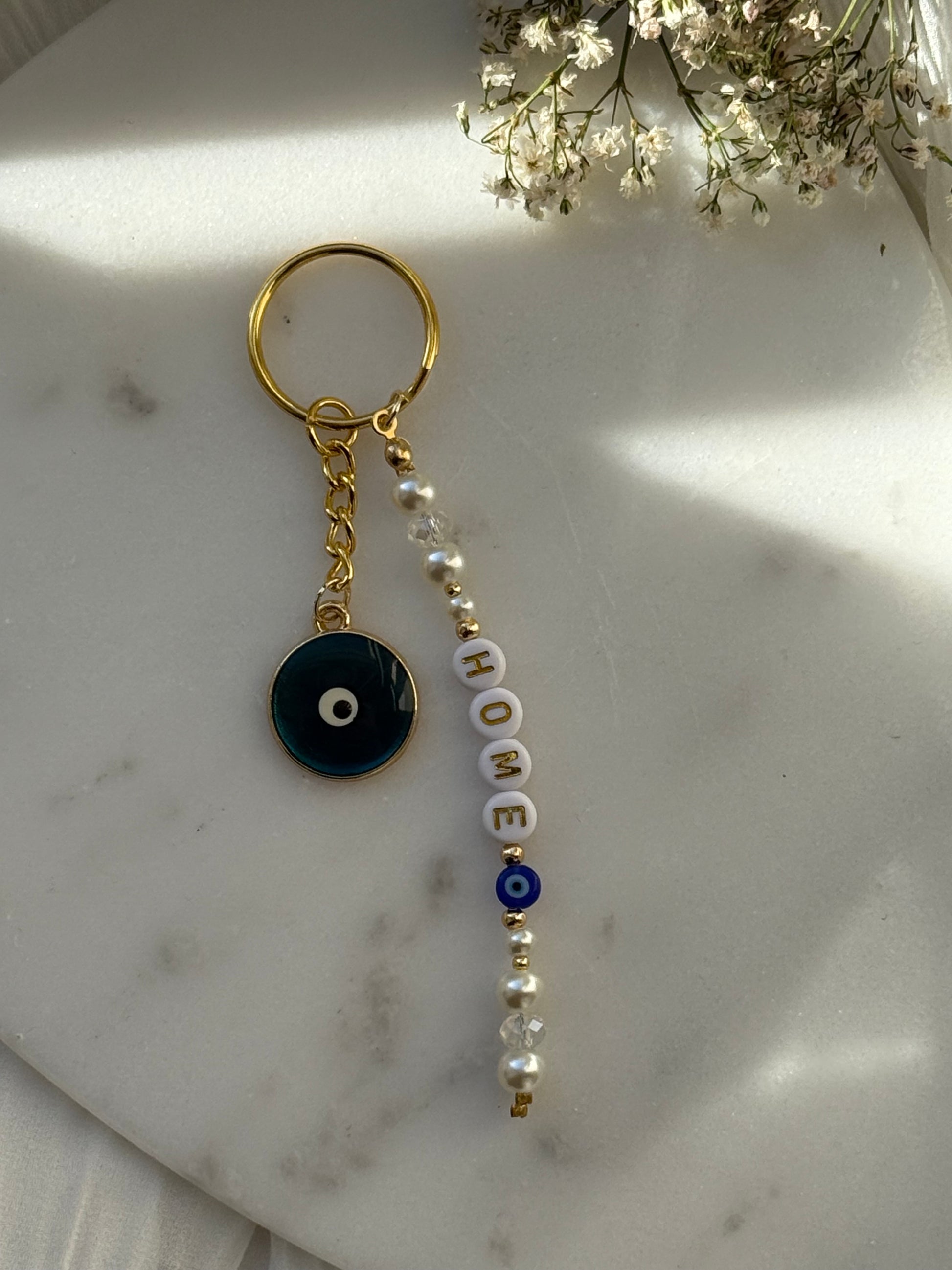 Schlüsselanhänger Home mit Weißen Perlen und Goldenen Perlen + Nazar Anhänger - 11024
