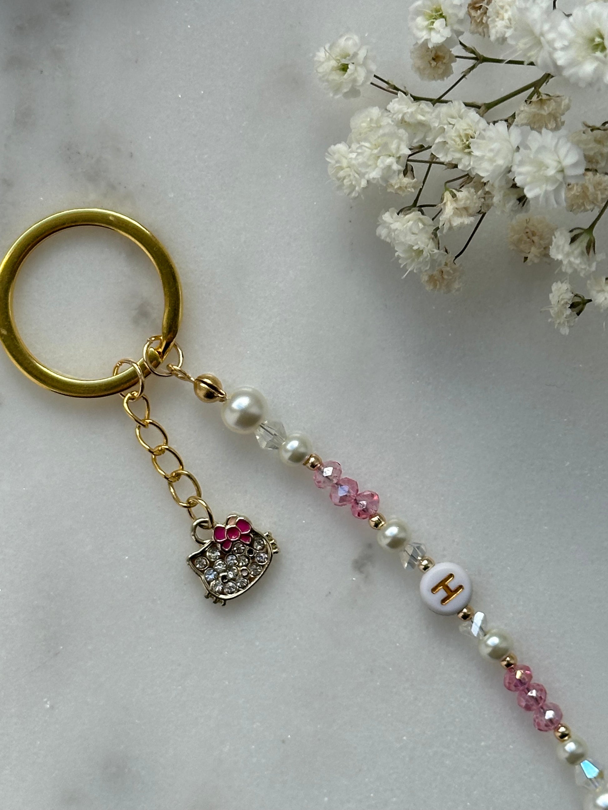 Der Schlüsselanhänger besteht aus weißen Perlen + Rosa Perlen + Anhänger 🫶🏽