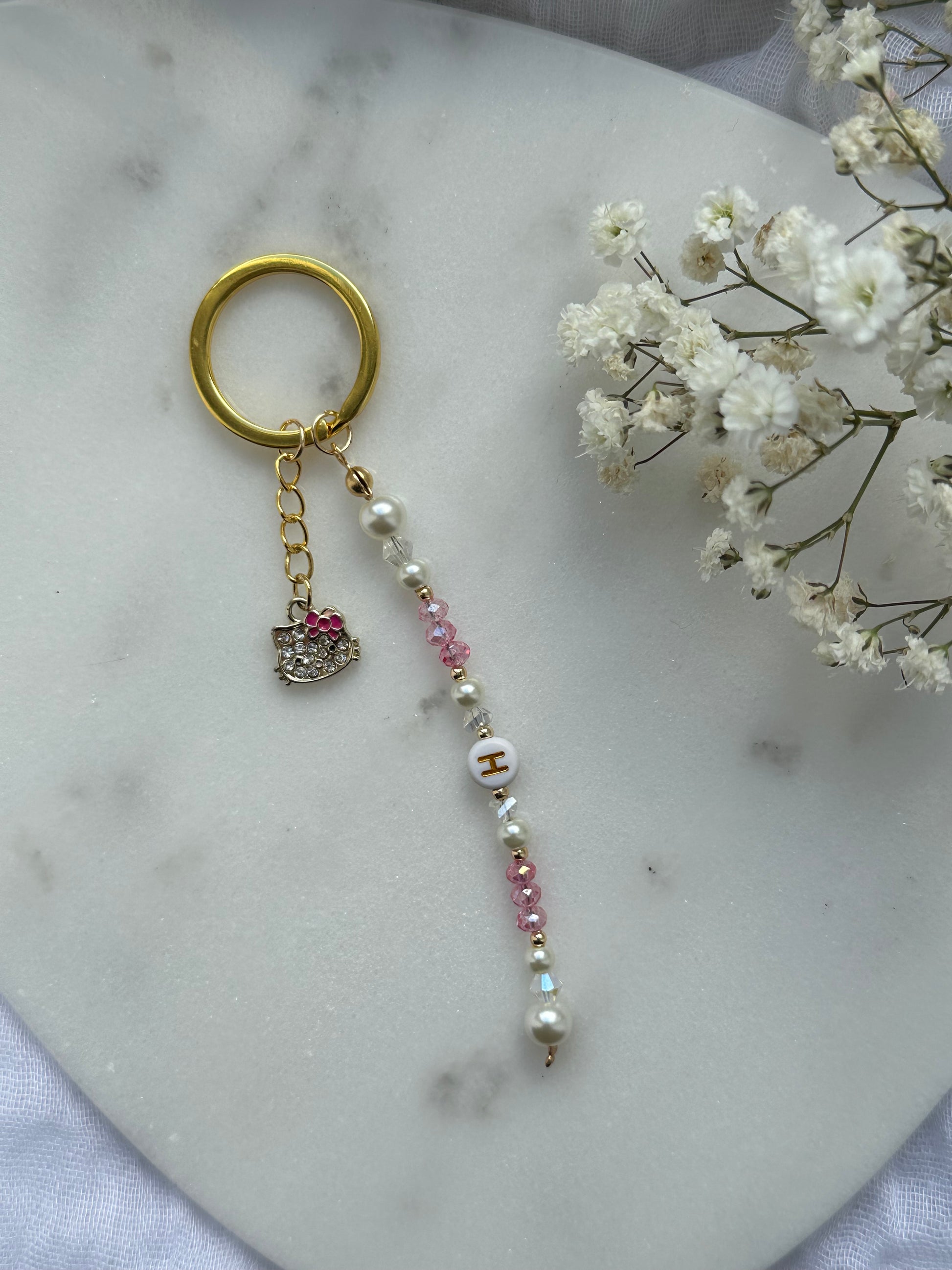 Schlüsselanhänger mit Weißen Perlen und Rosa Perlen + Katzen Anhänger - 10534