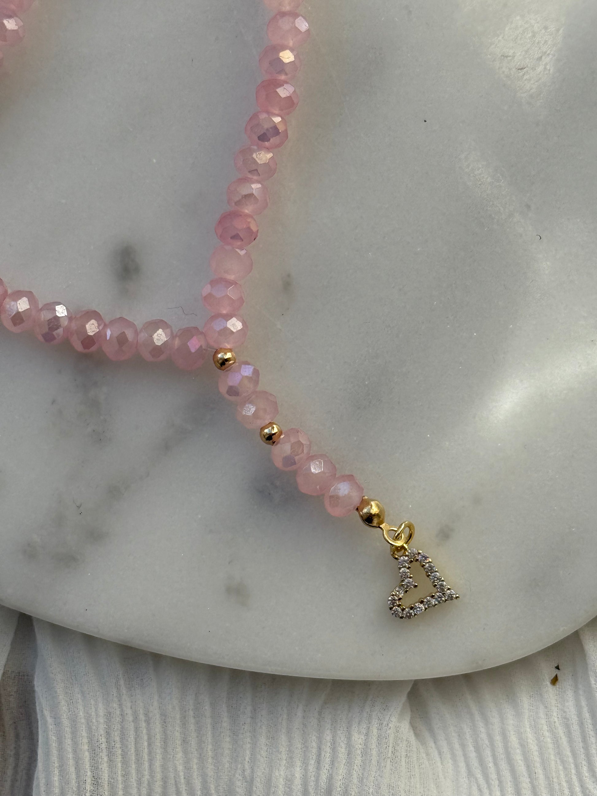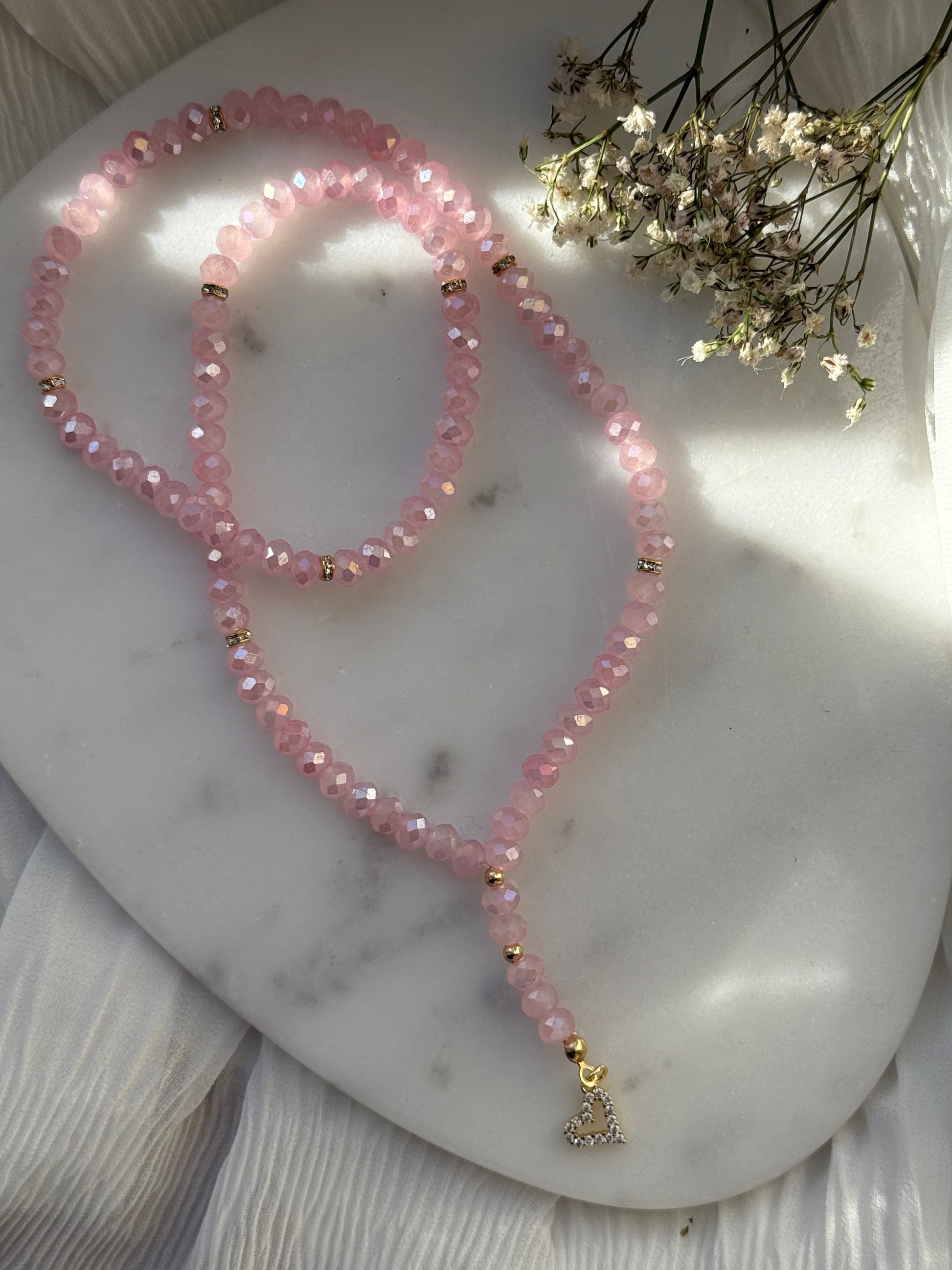Tesbih mit Rosa Kristallperlen, Goldenen Details + Herz Anhänger - 11016