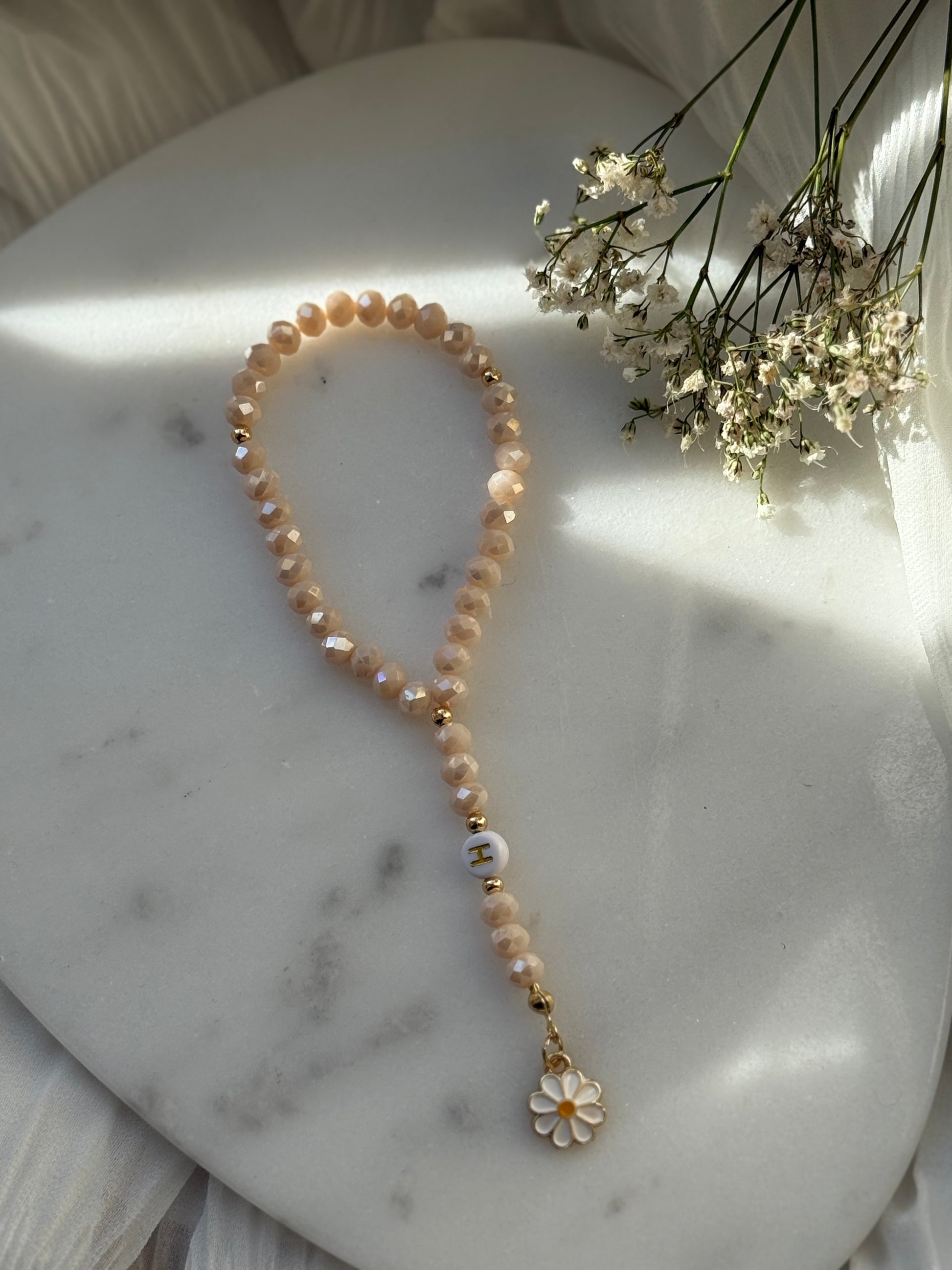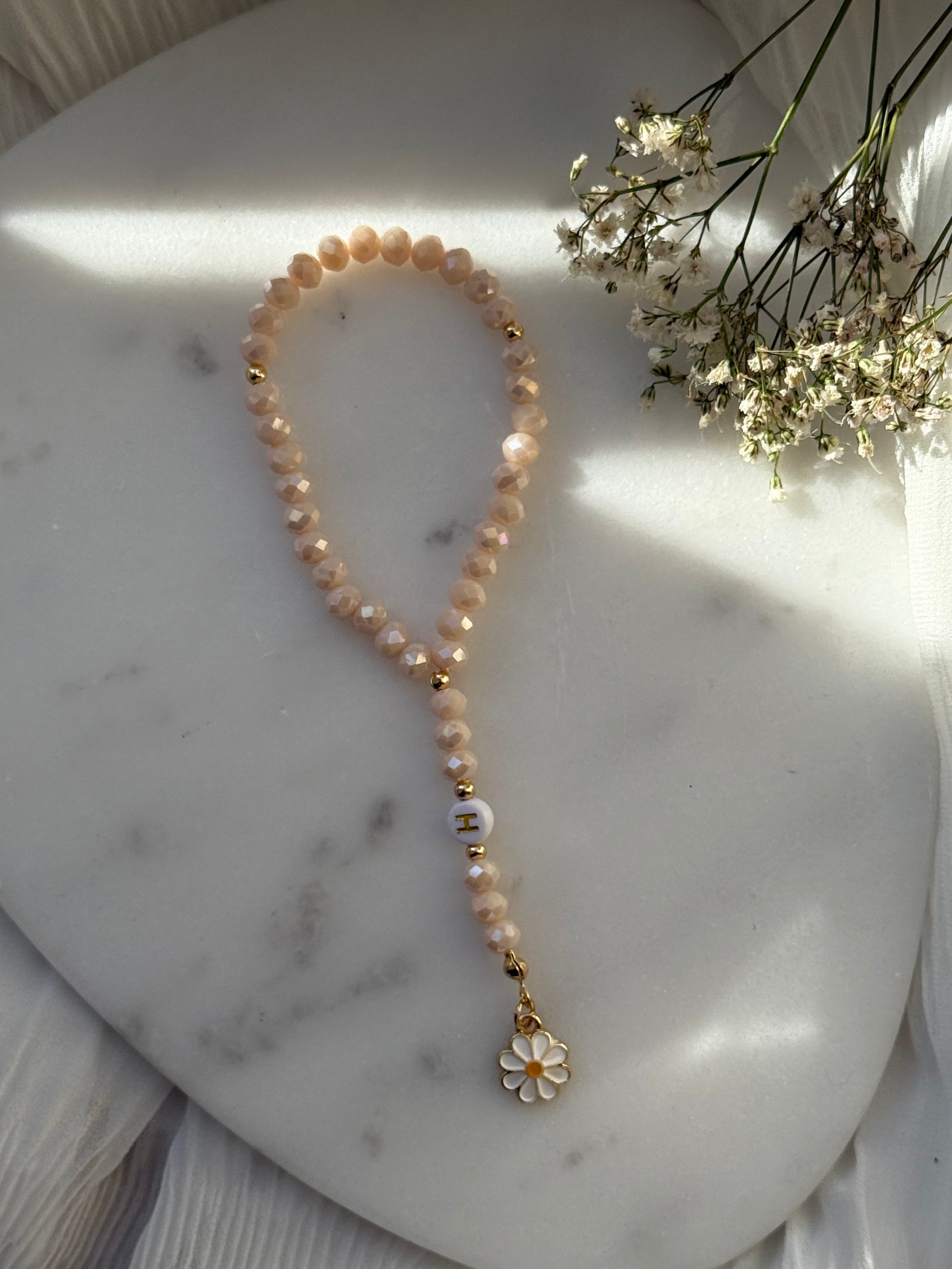 Tesbih personalisiert mit Beigen Kristallperlen, Goldenen Details + Papatya Anhänger - 11012