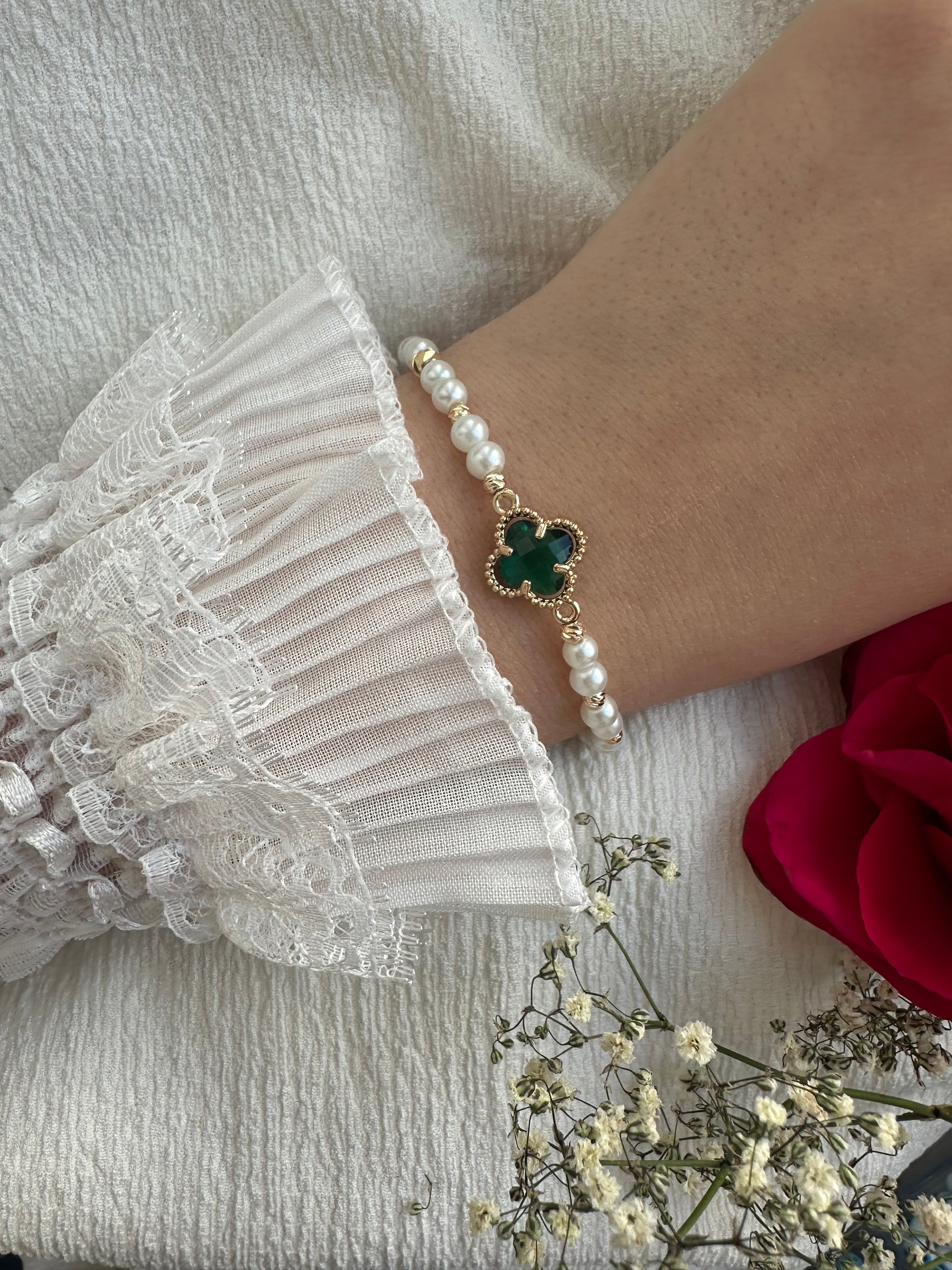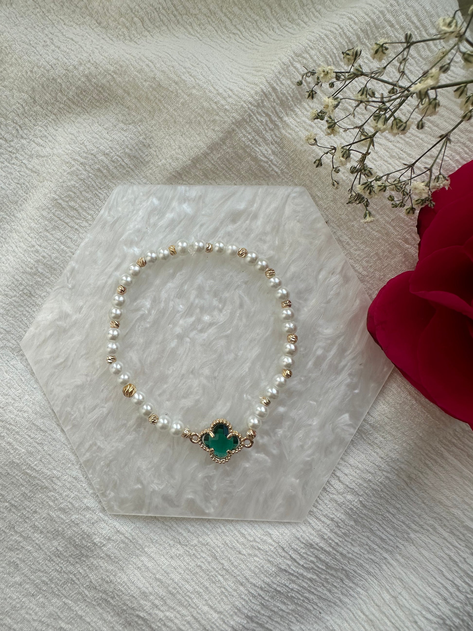 Diese Perlenarmband besteht aus weißen, Grünen und Goldenen Perlen und Kleeblatt Anhänger und stylt jedes Outfit auf!